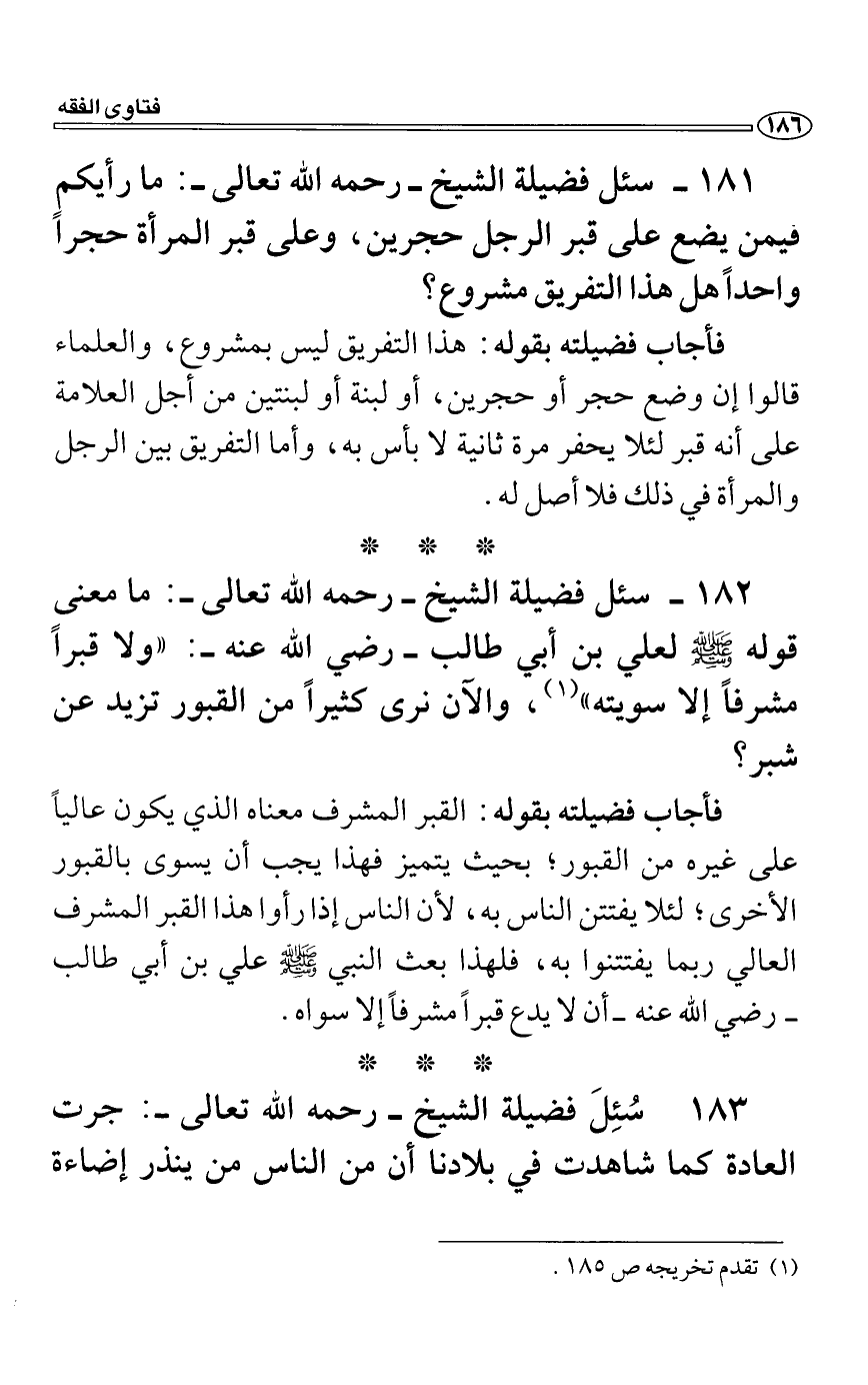 سئل فضيلة الشيخ رحمه الله تعالى: ما معنى قوله صَلَّى اللَّهُ عَلَيْهِ وَسَلَّمَ لعلي بن أبي طالب رضي الله عنه: "ولا قبراً مشرفاً إلا سويته"، والا?ن نرى كثيراً من القبور تزيد عن شبر؟