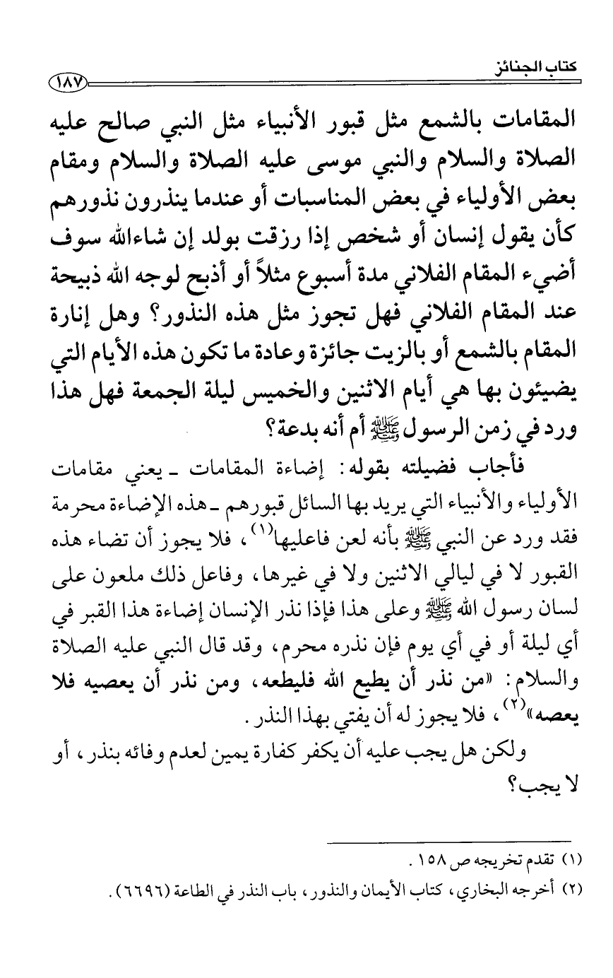 فأجاب فضيلته بقوله: إضاءة المقامات يعني مقامات الأولياء والأنبياء التي يريد بها السائل قبورهم هذه الإضاءة محرمة فقد ورد عن النبي صَلَّى اللَّهُ عَلَيْهِ وَسَلَّمَ بأنه لعن فاعليها، فلا يجوز أن تضاء هذه القبور لا في ليالي الاثنين ولا في غيرها، وفاعل ذلك ملعون على لسان رسول الله صَلَّى اللَّهُ عَلَيْهِ وَسَلَّمَ وعلى هذا فإذا نذر الإنسان إضاءة هذا القبر في أي ليلة أو في أي يوم فإن نذره محرم، وقد قال النبي عليه الصلاة والسلام: "من نذر أن يطيع الله فليطعه، ومن نذر أن يعصيه فلا يعصه"، فلا يجوز له أن يفتي بهذا النذر.