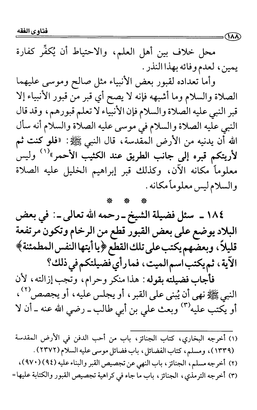 وأما تعداده لقبور بعض الأنبياء مثل صالح وموسى عليهما الصلاة والسلام وما أشبهه فإنه لا يصح أي قبر من قبور الأنبياء إلا قبر النبي عليه الصلاة والسلام فإن الأنبياء لا تعلم قبورهم، وقد قال النبي عليه الصلاة والسلام في موسى عليه الصلاة والسلام أنه سأل الله أن يدنيه من الأرض المقدسة، قال النبي صَلَّى اللَّهُ عَلَيْهِ وَسَلَّمَ: "فلو كنت ثم لأريتكم قبره إلى جانب الطريق عند الكثيب الأحمر" وليس معلوماً مكانه الا?ن، وكذلك قبر إبراهيم الخليل عليه الصلاة والسلام ليس معلوماً مكانه.