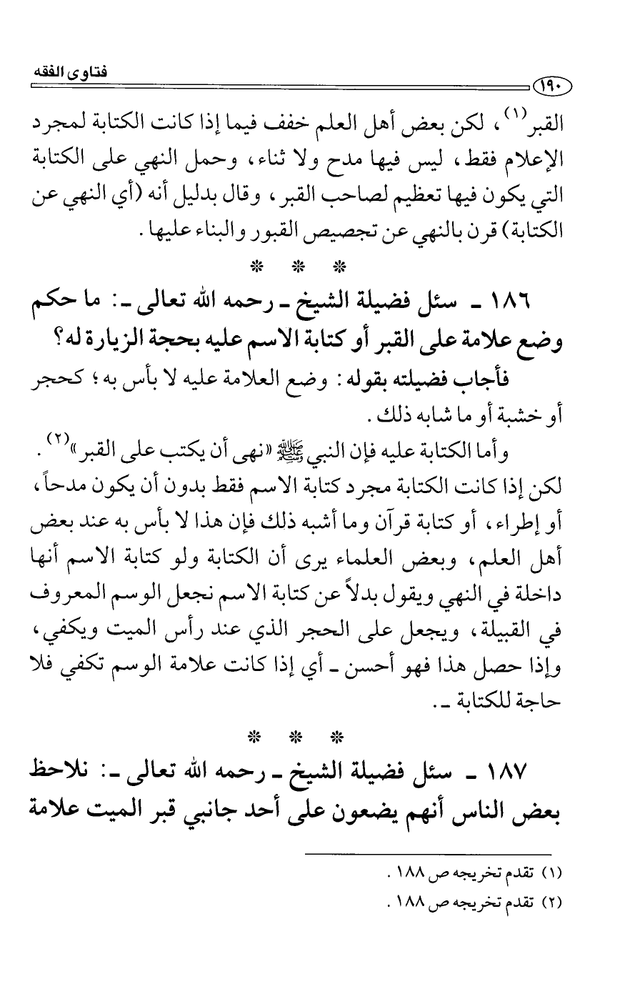 سئل فضيلة الشيخ رحمه الله تعالى: ما حكم وضع علامة على القبر أو كتابة الاسم عليه بحجة الزيارة له؟