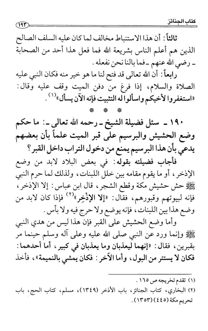 فأجاب فضيلته بقوله: في بعض البلاد لابد من وضع الإذخر، أو ما يقوم مقامه بين خلل اللبنات، ولذلك لما حرم النبي صَلَّى اللَّهُ عَلَيْهِ وَسَلَّمَ حش حشيش مكة وقطع الشجر، قال ابن عباس: إلا الإذخر، فإنه لبيوتهم وقبورهم، فقال: "إلا الإذْخِر" فإذا كان لابد من وضع هذا بين اللبنات، فإنه يوضع ولا حرج فيه ولا بأس.