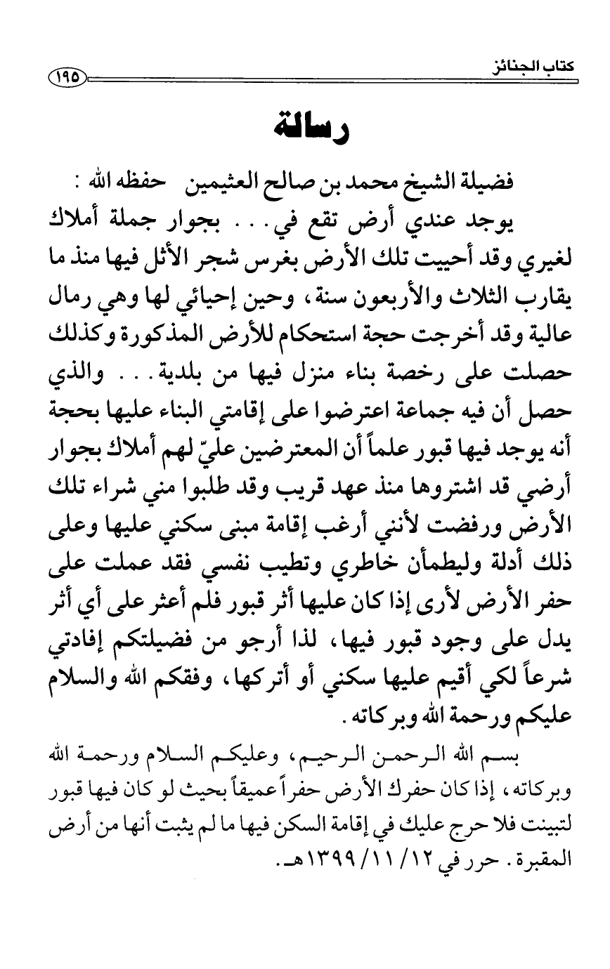 يوجد عندي أرض تقع في ... بجوار جملة أملاك لغيري وقد أحييت تلك الأرض بغرس شجر الأثل فيها منذ ما يقارب الثلاث والأربعون سنة، وحين إحيائي لها وهي رمال عالية وقد أخرجت حجة استحكام للأرض المذكورة وكذلك حصلت على رخصة بناء منزل فيها من بلدية ... والذي حصل أن فيه جماعة اعترضوا على إقامتي البناء عليها بحجة أنه يوجد فيها قبور علماً أن المعترضين عليّ لهم أملاك بجوار أرضي قد اشتروها منذ عهد قريب وقد طلبوا مني شراء تلك الأرض ورفضت لأنني أرغب إقامة مبنى سكني عليها وعلى ذلك أدلة وليطمأن خاطري وتطيب نفسي فقد عملت على حفر الأرض لأرى إذا كان عليها أثر قبور فلم أعثر على أي أثر يدل على وجود قبور فيها، لذا أرجو من فضيلتكم إفادتي شرعاً لكي أقيم عليها سكني أو أتركها، وفقكم الله والسلام عليكم ورحمة الله وبركاته.