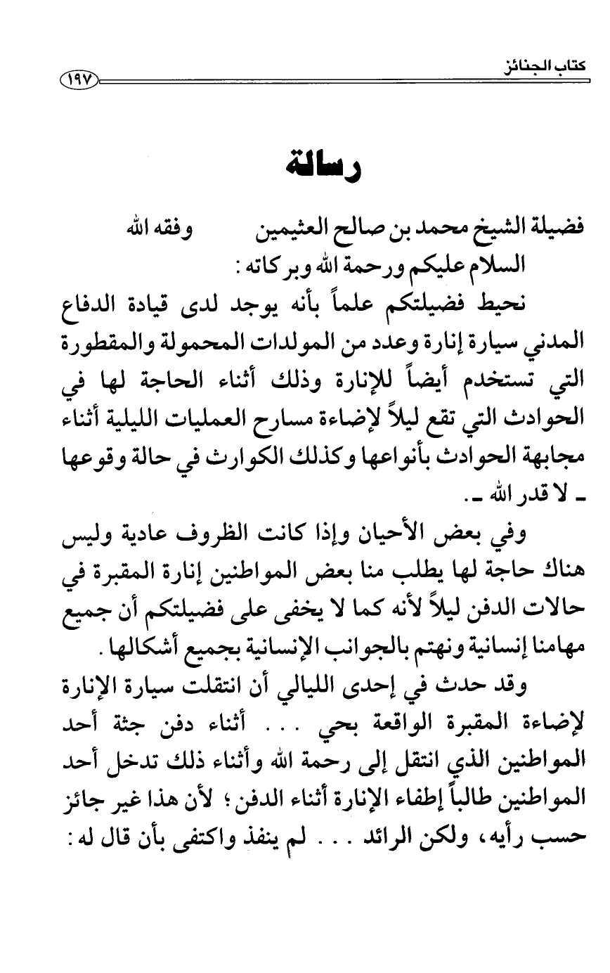 وقد حدث في إحدى الليالي أن انتقلت سيارة الإنارة لإضاءة المقبرة الواقعة بحي ... أثناء دفن جثة أحد المواطنين الذي انتقل إلى رحمة الله وأثناء ذلك تدخل أحد المواطنين طالباً إطفاء الإنارة أثناء الدفن؛ لأن هذا غير جائز حسب رأيه، ولكن الرائد ... لم ينفذ واكتفى بأن قال له: