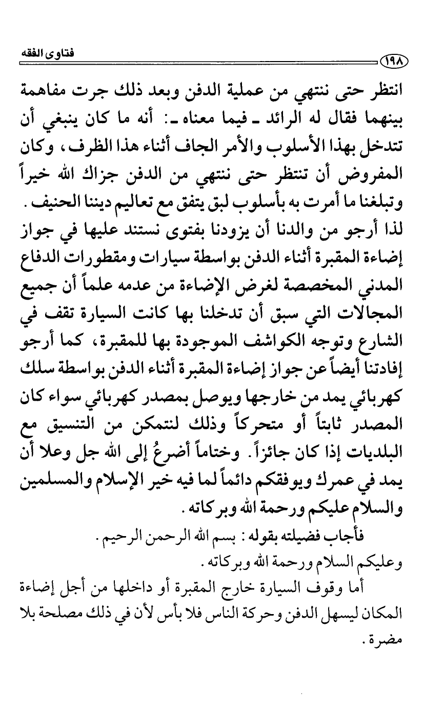 انتظر حتى ننتهي من عملية الدفن وبعد ذلك جرت مفاهمة بينهما فقال له الرائد فيما معناه: أنه ما كان ينبغي أن تتدخل بهذا الأسلوب والأمر الجاف أثناء هذا الظرف، وكان المفروض أن تنتظر حتى ننتهي من الدفن جزاك الله خيراً وتبلغنا ما أمرت به بأسلوب لبق يتفق مع تعاليم ديننا الحنيف. لذا أرجو من والدنا أن يزودنا بفتوى نستند عليها في جواز إضاءة المقبرة أثناء الدفن بواسطة سيارات ومقطورات الدفاع المدني المخصصة لغرض الإضاءة من عدمه علماً أن جميع المجالات التي سبق أن تدخلنا بها كانت السيارة تقف في الشارع وتوجه الكواشف الموجودة بها للمقبرة، كما أرجو إفادتنا أيضاً عن جواز إضاءة المقبرة أثناء الدفن بواسطة سلك كهربائي يمد من خارجها ويوصل بمصدر كهربائي سواء كان المصدر ثابتاً أو متحركاً وذلك لنتمكن من التنسيق مع البلديات إذا كان جائزاً. وختاماً أضرعُ إلى الله جل وعلا أن يمد في عمرك ويوفقكم دائماً لما فيه خير الإسلام والمسلمين والسلام عليكم ورحمة الله وبركاته.