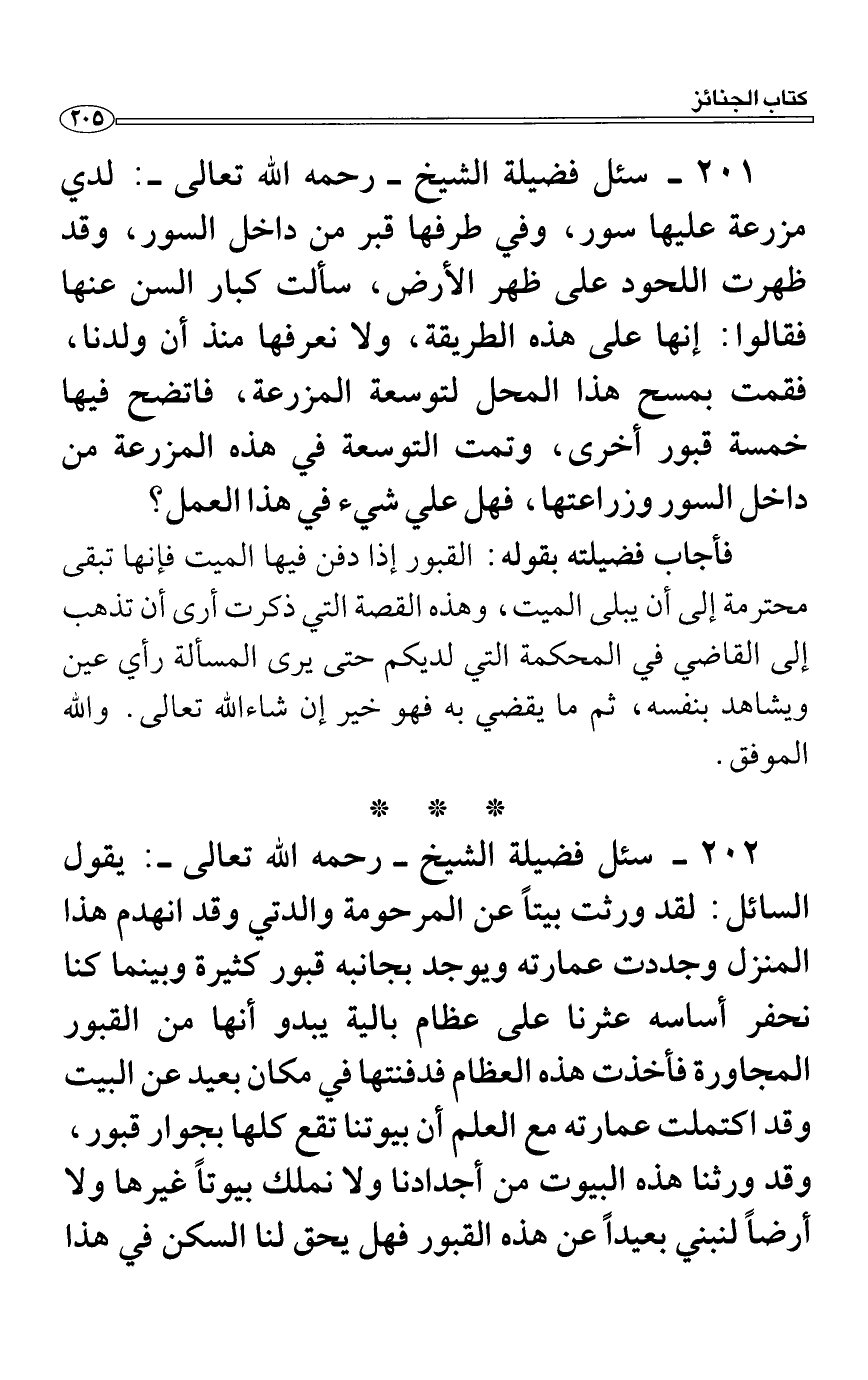 سئل فضيلة الشيخ رحمه الله تعالى: لدي مزرعة عليها سور، وفي طرفها قبر من داخل السور، وقد ظهرت اللحود على ظهر الأرض، سألت كبار السن عنها فقالوا: إنها على هذه الطريقة، ولا نعرفها منذ أن ولدنا، فقمت بمسح هذا المحل لتوسعة المزرعة، فاتضح فيها خمسة قبور أخرى، وتمت التوسعة في هذه المزرعة من داخل السور وزراعتها، فهل علي شيء في هذا العمل؟