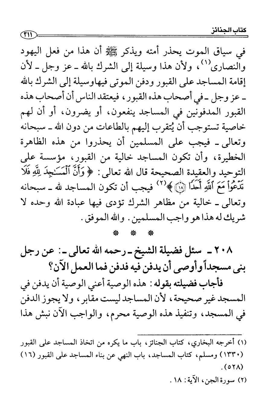 فأجاب فضيلته بقوله: هذه الوصية أعني الوصية أن يدفن في المسجد غير صحيحة، لأن المساجد ليست مقابر، ولا يجوز الدفن في المسجد، وتنفيذ هذه الوصية محرم، والواجب الا?ن نبش هذا