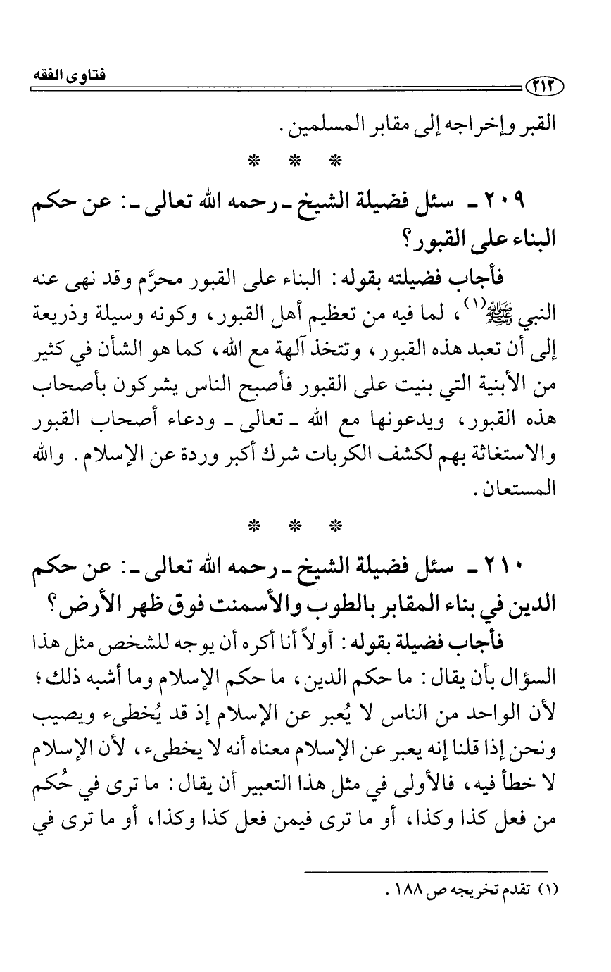 سئل فضيلة الشيخ رحمه الله تعالى: عن حكم الدين في بناء المقابر بالطوب والأسمنت فوق ظهر الأرض؟