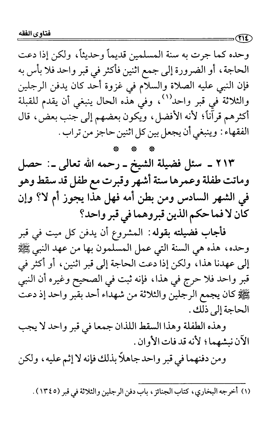 فأجاب فضيلته بقوله: المشروع أن يدفن كل ميت في قبر وحده، هذه هي السنة التي عمل المسلمون بها من عهد النبي صَلَّى اللَّهُ عَلَيْهِ وَسَلَّمَ إلى عهدنا هذا، ولكن إذا دعت الحاجة إلى قبر اثنين، أو أكثر في قبر واحد فلا حرج في هذا، فإنه ثبت في الصحيح وغيره أن النبي صَلَّى اللَّهُ عَلَيْهِ وَسَلَّمَ كان يجمع الرجلين والثلاثة من شهداء أحد بقبر واحد إذ دعت الحاجة إلى ذلك.