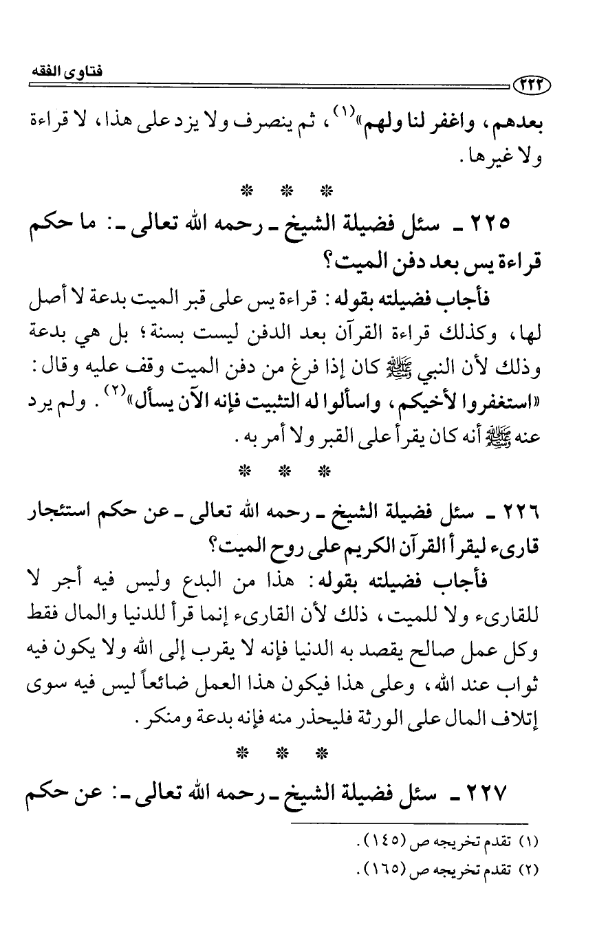 فأجاب فضيلته بقوله: قراءة يس على قبر الميت بدعة لا أصل لها، وكذلك قراءة القرآن بعد الدفن ليست بسنة؛ بل هي بدعة وذلك لأن النبي صَلَّى اللَّهُ عَلَيْهِ وَسَلَّمَ كان إذا فرغ من دفن الميت وقف عليه وقال: "استغفروا لأخيكم، واسألوا له التثبيت فإنه الا?ن يسأل". ولم يرد عنه صَلَّى اللَّهُ عَلَيْهِ وَسَلَّمَ أنه كان يقرأ على القبر ولا أمر به.