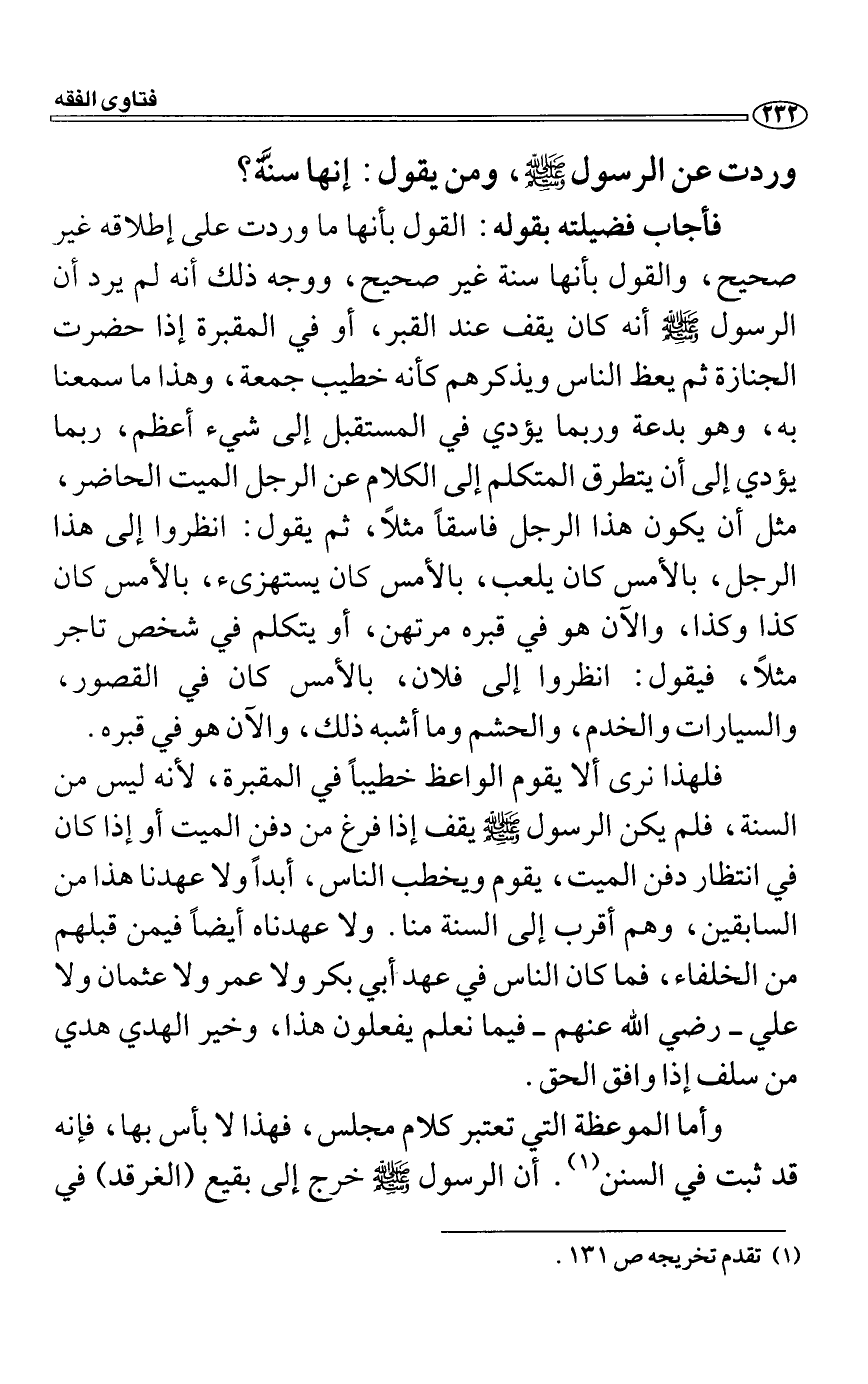 فأجاب فضيلته بقوله: القول بأنها ما وردت على إطلاقه غير صحيح، والقول بأنها سنة غير صحيح، ووجه ذلك أنه لم يرد أن الرسول صَلَّى اللَّهُ عَلَيْهِ وَسَلَّمَ أنه كان يقف عند القبر، أو في المقبرة إذا حضرت الجنازة ثم يعظ الناس ويذكرهم كأنه خطيب جمعة، وهذا ما سمعنا به، وهو بدعة وربما يؤدي في المستقبل إلى شيء أعظم، ربما يؤدي إلى أن يتطرق المتكلم إلى الكلام عن الرجل الميت الحاضر، مثل أن يكون هذا الرجل فاسقاً مثلاً، ثم يقول: انظروا إلى هذا الرجل، بالأمس كان يلعب، بالأمس كان يستهزىء، بالأمس كان كذا وكذا، والا?ن هو في قبره مرتهن، أو يتكلم في شخص تاجر مثلاً، فيقول: انظروا إلى فلان، بالأمس كان في القصور، والسيارات والخدم، والحشم وما أشبه ذلك، والا?ن هو في قبره.