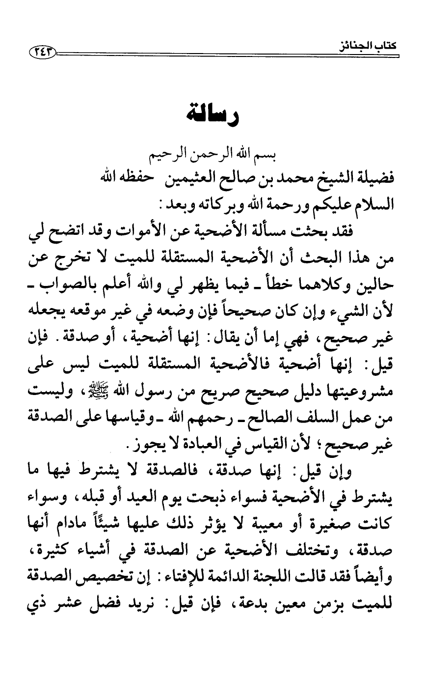 فقد بحثت مسألة الأضحية عن الأموات وقد اتضح لي من هذا البحث أن الأضحية المستقلة للميت لا تخرج عن حالين وكلاهما خطأ فيما يظهر لي والله أعلم بالصواب لأن الشيء وإن كان صحيحاً فإن وضعه في غير موقعه يجعله غير صحيح، فهي إما أن يقال: إنها أضحية، أو صدقة. فإن قيل: إنها أضحية فالأضحية المستقلة للميت ليس على مشروعيتها دليل صحيح صريح من رسول الله صَلَّى اللَّهُ عَلَيْهِ وَسَلَّمَ، وليست من عمل السلف الصالح رحمهم الله وقياسها على الصدقة غير صحيح؛ لأن القياس في العبادة لا يجوز.