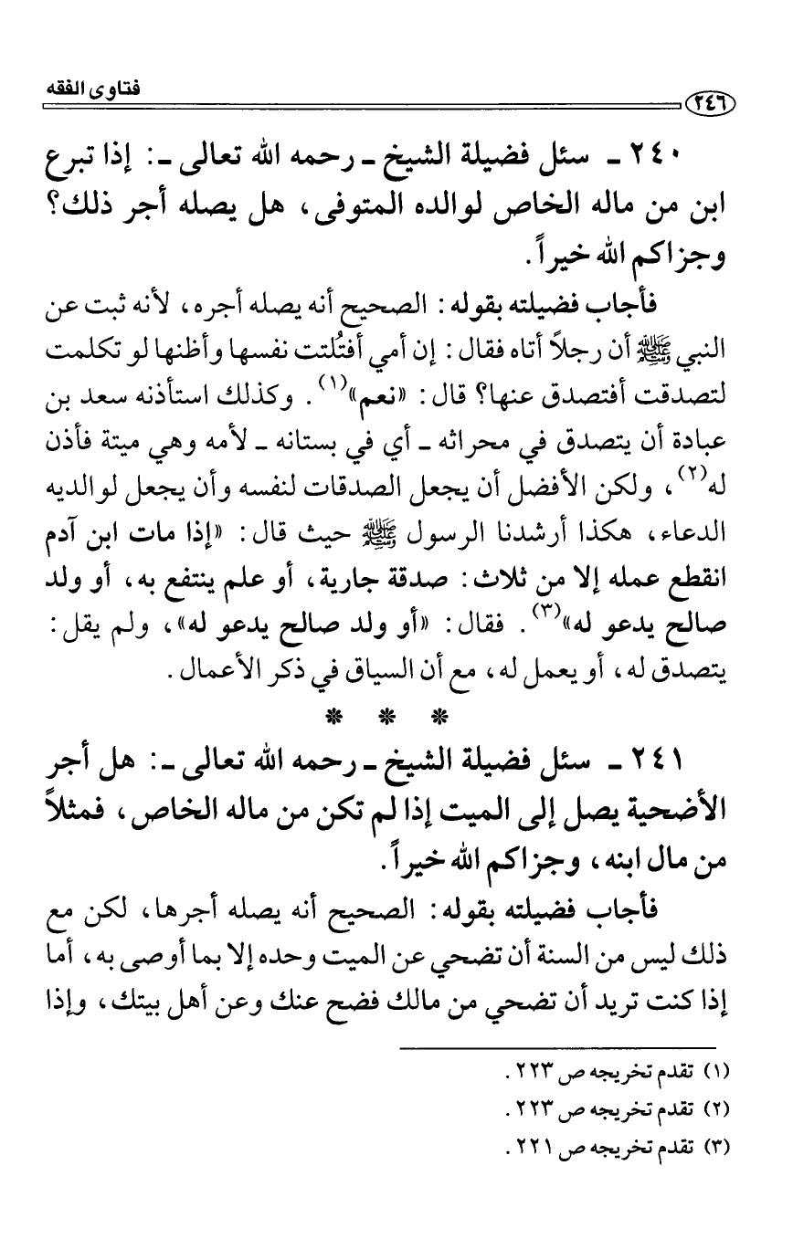سئل فضيلة الشيخ رحمه الله تعالى: إذا تبرع ابن من ماله الخاص لوالده المتوفى، هل يصله أجر ذلك؟ وجزاكم الله خيراً.