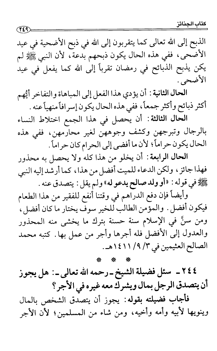 سئل فضيلة الشيخ رحمه الله تعالى: هل يجوز أن يتصدق الرجل بمال ويشرك معه غيره في الأجر؟
