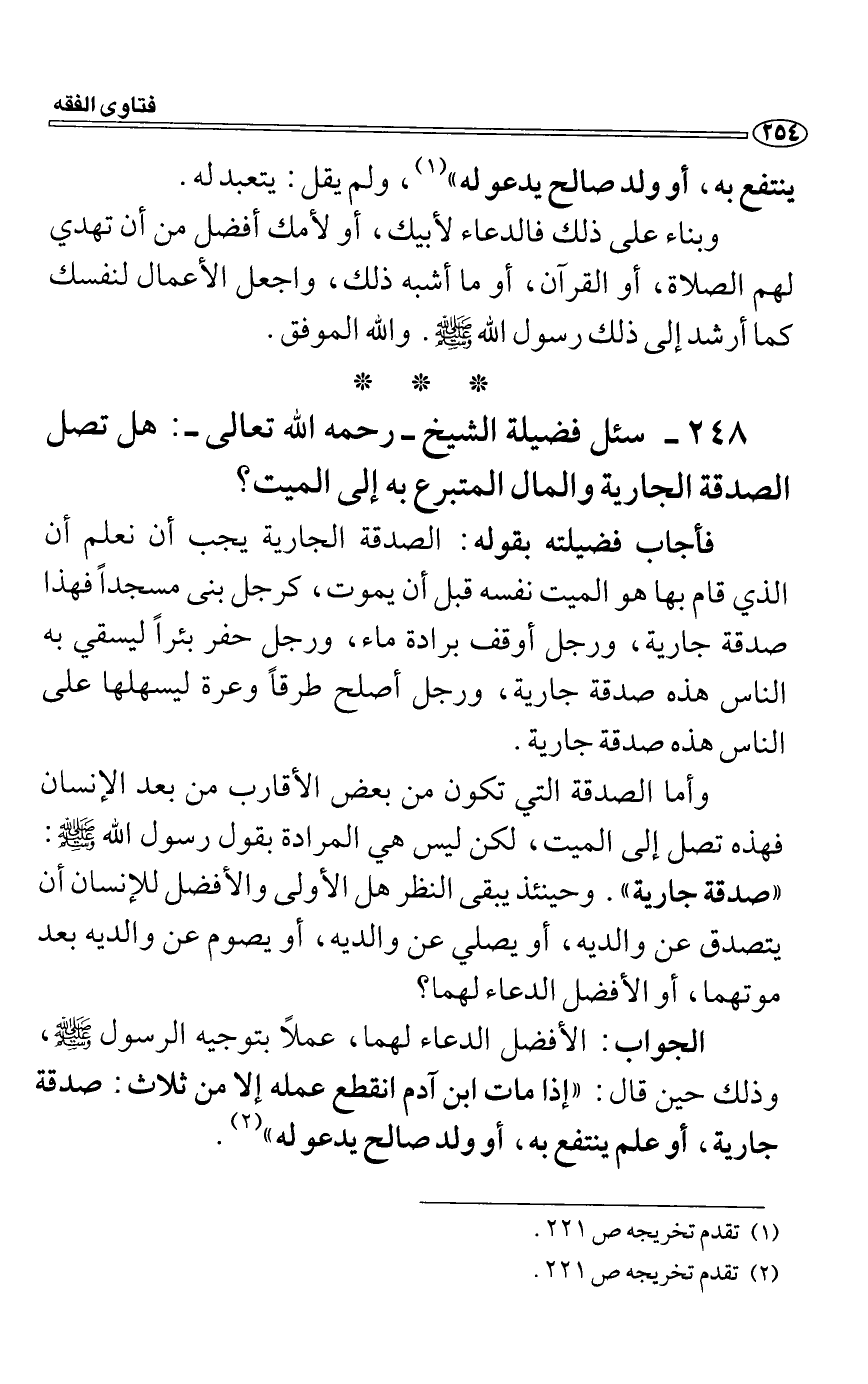 فأجاب فضيلته بقوله: الصدقة الجارية يجب أن نعلم أن الذي قام بها هو الميت نفسه قبل أن يموت، كرجل بنى مسجداً فهذا صدقة جارية، ورجل أوقف برادة ماء، ورجل حفر بئراً ليسقي به الناس هذه صدقة جارية، ورجل أصلح طرقاً وعرة ليسهلها على الناس هذه صدقة جارية.