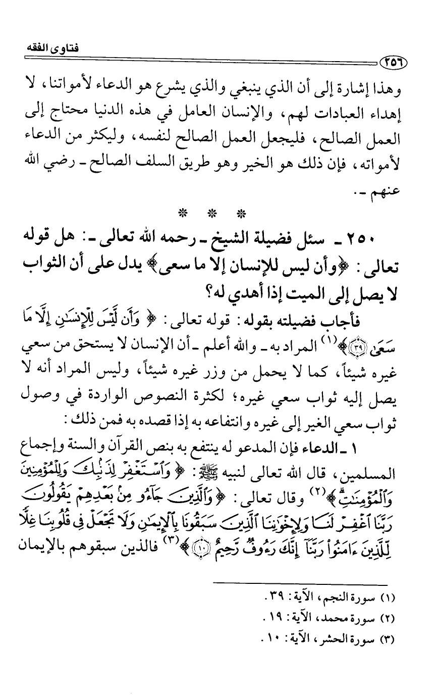 فأجاب فضيلته بقوله: قوله تعالى: {وَأَن لَّيْسَ لِلإِنسَانِ إِلاَّ مَا سَعَى} المراد به والله أعلم أن الإنسان لا يستحق من سعي غيره شيئاً، كما لا يحمل من وزر غيره شيئاً، وليس المراد أنه لا يصل إليه ثواب سعي غيره؛ لكثرة النصوص الواردة في وصول ثواب سعي الغير إلى غيره وانتفاعه به إذا قصده به فمن ذلك: