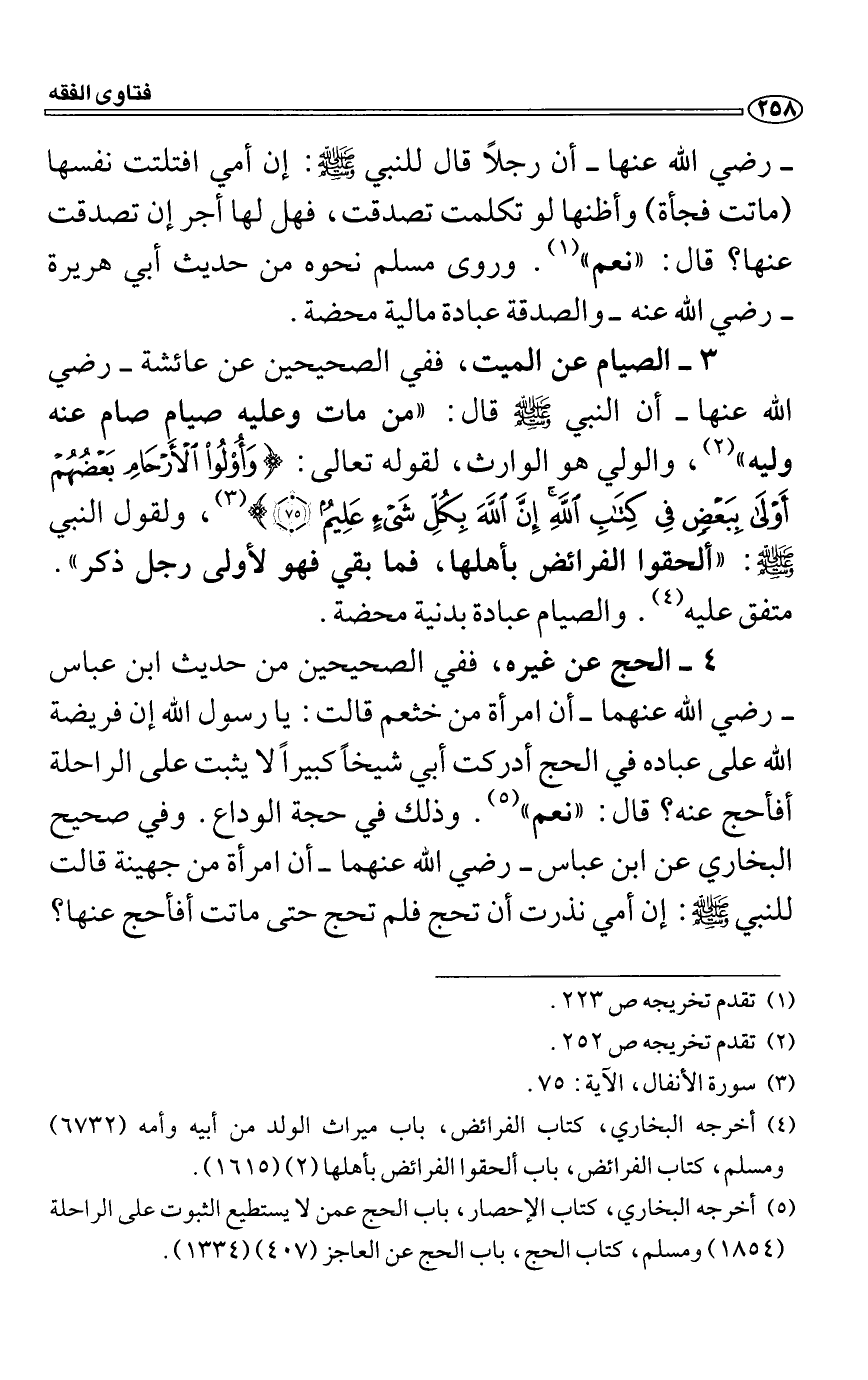 4 الحج عن غيره، ففي الصحيحين من حديث ابن عباس رضي الله عنهما أن امرأة من خثعم قالت: يا رسول الله إن فريضة الله على عباده في الحج أدركت أبي شيخاً كبيراً لا يثبت على الراحلة أفأحج عنه؟ قال: "نعم". وذلك في حجة الوداع. وفي صحيح البخاري عن ابن عباس رضي الله عنهما أن امرأة من جهينة قالت للنبي صَلَّى اللَّهُ عَلَيْهِ وَسَلَّمَ: إن أمي نذرت أن تحج فلم تحج حتى ماتت أفأحج عنها؟