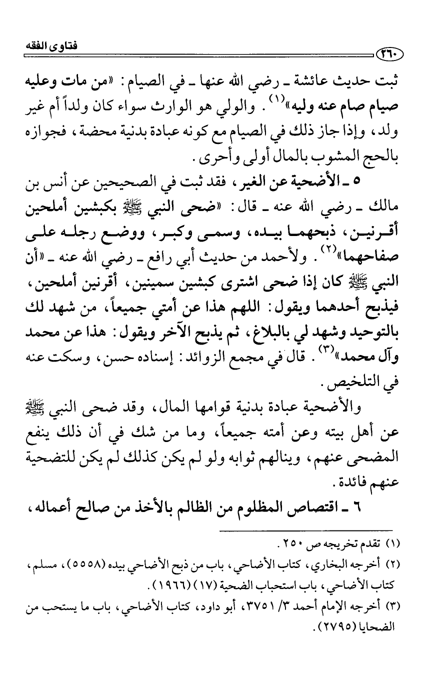 5 الأضحية عن الغير، فقد ثبت في الصحيحين عن أنس بن مالك رضي الله عنه قال: "ضحى النبي صَلَّى اللَّهُ عَلَيْهِ وَسَلَّمَ بكبشين أملحين أقرنين، ذبحهما بيده، وسمى وكبر، ووضع رجله على صفاحهما". ولأحمد من حديث أبي رافع رضي الله عنه "أن النبي صَلَّى اللَّهُ عَلَيْهِ وَسَلَّمَ كان إذا ضحى اشترى كبشين سمينين، أقرنين أملحين، فيذبح أحدهما ويقول: اللهم هذا عن أمتي جميعاً، من شهد لك بالتوحيد وشهد لي بالبلاغ، ثم يذبح الآخر ويقول: هذا عن محمد وآل محمد". قال في مجمع الزوائد: إسناده حسن، وسكت عنه في التلخيص.
