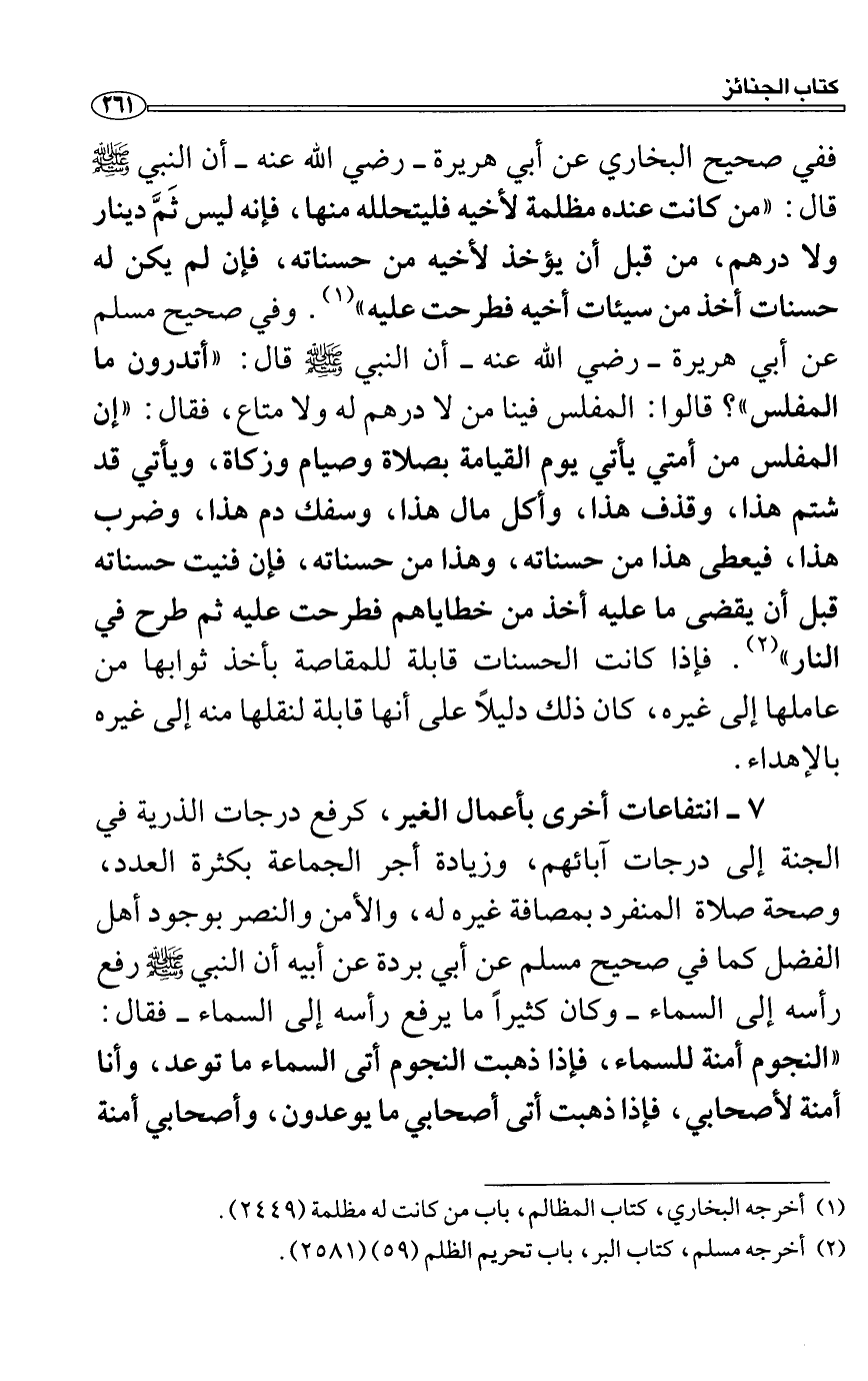 ففي صحيح البخاري عن أبي هريرة رضي الله عنه أن النبي صَلَّى اللَّهُ عَلَيْهِ وَسَلَّمَ قال: "من كانت عنده مظلمة لأخيه فليتحلله منها، فإنه ليس ثَمَّ دينار ولا درهم، من قبل أن يؤخذ لأخيه من حسناته، فإن لم يكن له حسنات أخذ من سيئات أخيه فطرحت عليه". وفي صحيح مسلم عن أبي هريرة رضي الله عنه أن النبي صَلَّى اللَّهُ عَلَيْهِ وَسَلَّمَ قال: "أتدرون ما المفلس"؟ قالوا: المفلس فينا من لا درهم له ولا متاع، فقال: "إن المفلس من أمتي يأتي يوم القيامة بصلاة وصيام وزكاة، ويأتي قد شتم هذا، وقذف هذا، وأكل مال هذا، وسفك دم هذا، وضرب هذا، فيعطى هذا من حسناته، وهذا من حسناته، فإن فنيت حسناته قبل أن يقضى ما عليه أخذ من خطاياهم فطرحت عليه ثم طرح في النار". فإذا كانت الحسنات قابلة للمقاصة بأخذ ثوابها من عاملها إلى غيره، كان ذلك دليلاً على أنها قابلة لنقلها منه إلى غيره بالإهداء.