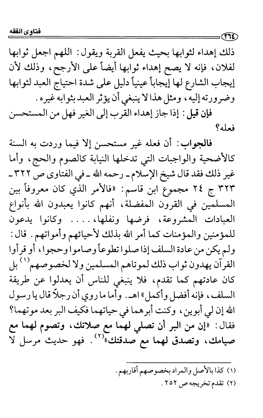 فالجواب: أن فعله غير مستحسن إلا فيما وردت به السنة كالأضحية والواجبات التي تدخلها النيابة كالصوم والحج، وأما غير ذلك فقد قال شيخ الإسلام رحمه الله في الفتاوى ص 223 323 ج 42 مجموع ابن قاسم: "فالأمر الذي كان معروفاً بين المسلمين في القرون المفضلة، أنهم كانوا يعبدون الله بأنواع العبادات المشروعة، فرضها ونفلها،.... وكانوا يدعون للمؤمنين والمؤمنات كما أمر الله بذلك لأحيائهم وأمواتهم. قال: ولم يكن من عادة السلف إذا صلوا تطوعاً وصاموا وحجوا، أو قرأوا القرآن يهدون ثواب ذلك لموتاهم المسلمين ولا لخصوصهم بل كان عادتهم كما تقدم، فلا ينبغي للناس أن يعدلوا عن طريقة السلف، فإنه أفضل وأكمل" اه. وأما ما روي أن رجلاً قال يا رسول الله إن لي أبوين، وكنت أبرهما في حياتهما فكيف البر بعد موتهما؟ فقال: "إن من البر أن تصلي لهما مع صلاتك، وتصوم لهما مع صيامك، وتصدق لهما مع صدقتك". فهو حديث مرسل لا