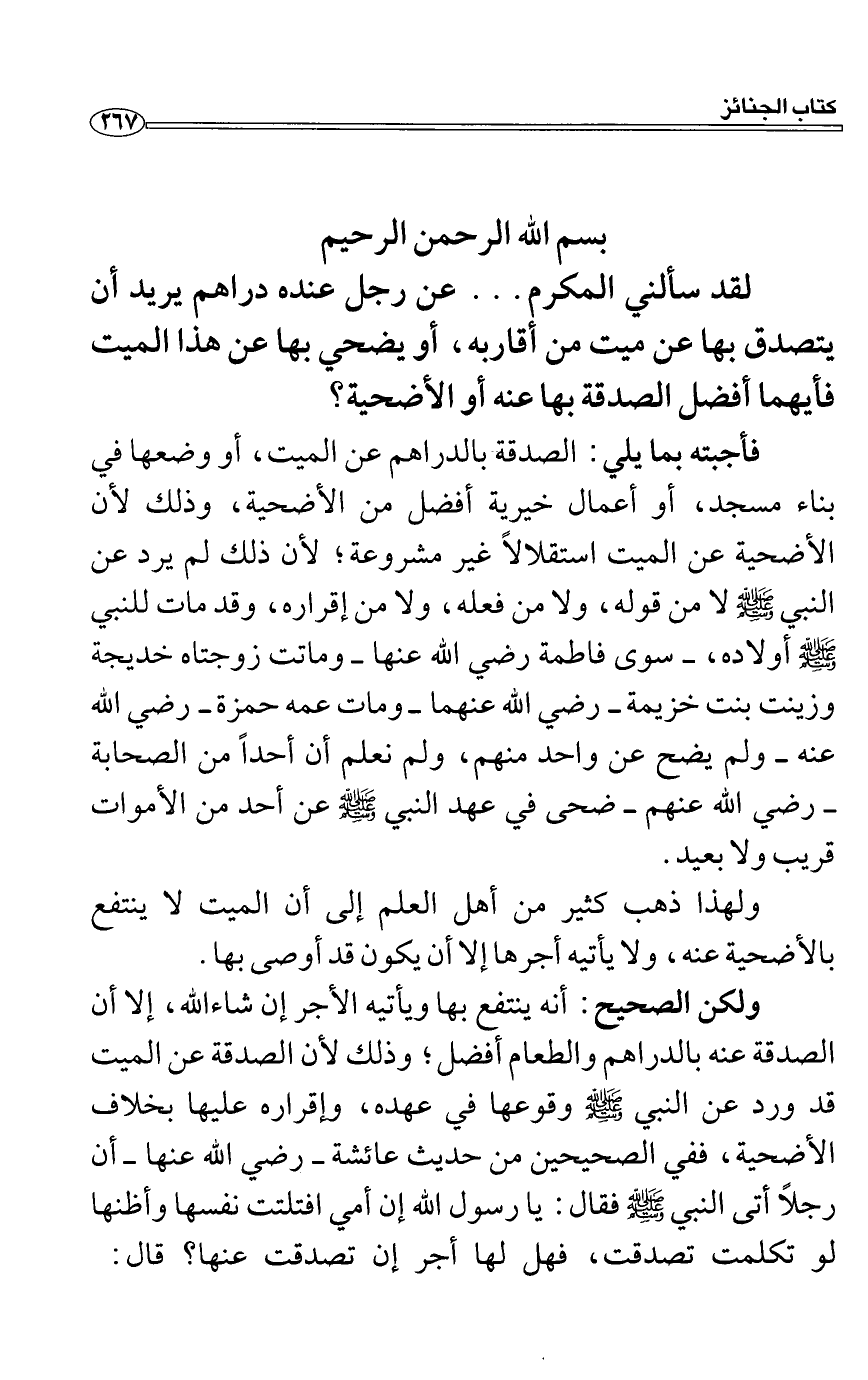 فأجبته بما يلي: الصدقة بالدراهم عن الميت، أو وضعها في بناء مسجد، أو أعمال خيرية أفضل من الأضحية، وذلك لأن الأضحية عن الميت استقلالاً غير مشروعة؛ لأن ذلك لم يرد عن النبي صَلَّى اللَّهُ عَلَيْهِ وَسَلَّمَ لا من قوله، ولا من فعله، ولا من إقراره، وقد مات للنبي صَلَّى اللَّهُ عَلَيْهِ وَسَلَّمَ أولاده، سوى فاطمة رضي الله عنها وماتت زوجتاه خديجة وزينت بنت خزيمة رضي الله عنهما ومات عمه حمزة رضي الله عنه ولم يضح عن واحد منهم، ولم نعلم أن أحداً من الصحابة رضي الله عنهم ضحى في عهد النبي صَلَّى اللَّهُ عَلَيْهِ وَسَلَّمَ عن أحد من الأموات قريب ولا بعيد.