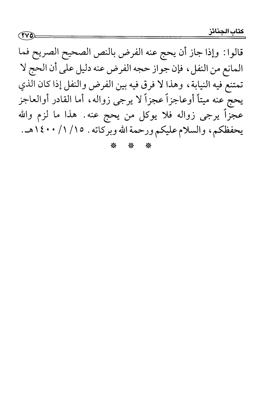 قالوا: وإذا جاز أن يحج عنه الفرض بالنص الصحيح الصريح فما المانع من النفل، فإن جواز حجه الفرض عنه دليل على أن الحج لا تمتنع فيه النيابة، وهذا لا فرق فيه بين الفرض والنفل إذا كان الذي يحج عنه ميتاً أوعاجزاً عجزاً لا يرجى زواله، أما القادر أوالعاجز عجزاً يرجى زواله فلا يوكل من يحج عنه. هذا ما لزم والله يحفظكم، والسلام عليكم ورحمة الله وبركاته. 51/1/1400 هـ.
