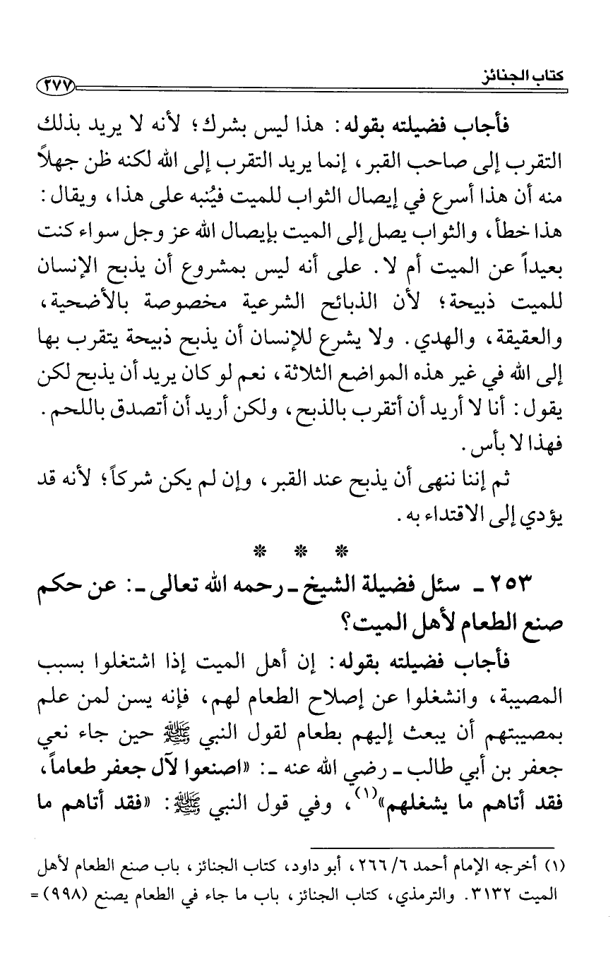 فأجاب فضيلته بقوله: إن أهل الميت إذا اشتغلوا بسبب المصيبة، وانشغلوا عن إصلاح الطعام لهم، فإنه يسن لمن علم بمصيبتهم أن يبعث إليهم بطعام لقول النبي صَلَّى اللَّهُ عَلَيْهِ وَسَلَّمَ حين جاء نعي جعفر بن أبي طالب رضي الله عنه: "اصنعوا لا?ل جعفر طعاماً، فقد أتاهم ما يشغلهم"، وفي قول النبي صَلَّى اللَّهُ عَلَيْهِ وَسَلَّمَ: "فقد أتاهم ما يشغلهم" إشارة إلى أن ذلك ليس مستحباً على سبيل الإطلاق، ولكنه مستحب إذا كان أهل الميت قد انشغلوا عن إصلاح الطعام، أما إذا كان الأمر طبيعياً كما هو المعروف في عهدنا الا?ن فإنه لا يسن أن يبعث إليهم بطعام؛ لأن الحكم يدور مع علته وجوداً وعدماً، فإن النبي صَلَّى اللَّهُ عَلَيْهِ وَسَلَّمَ حينما قال "ابعثوا لا?ل جعفر طعام" لم يقل: (فإنه قد مات لهم ميت) ، وإنما قال: "فقد أتاهم ما