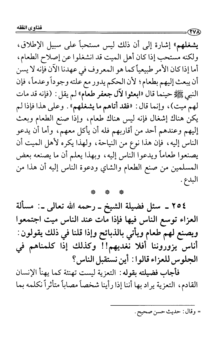 يشغلهم". وعلى هذا فإذا لم يكن هناك إشغال فإنه ليس هناك طعام، وإذا صنع الطعام وبعث إليهم وعندهم أحد من أقاربهم فله أن يأكل معهم، وأما أن يدعو الناس إليه، فإن هذا نوع من النياحة، ولهذا يكره لأهل الميت أن يصنعوا طعاماً ويدعوا الناس إليه، وبهذا يعلم أن ما يصنعه بعض المسلمين من صنع الطعام والشاي ودعوة الناس إليه أن هذا من البدع.