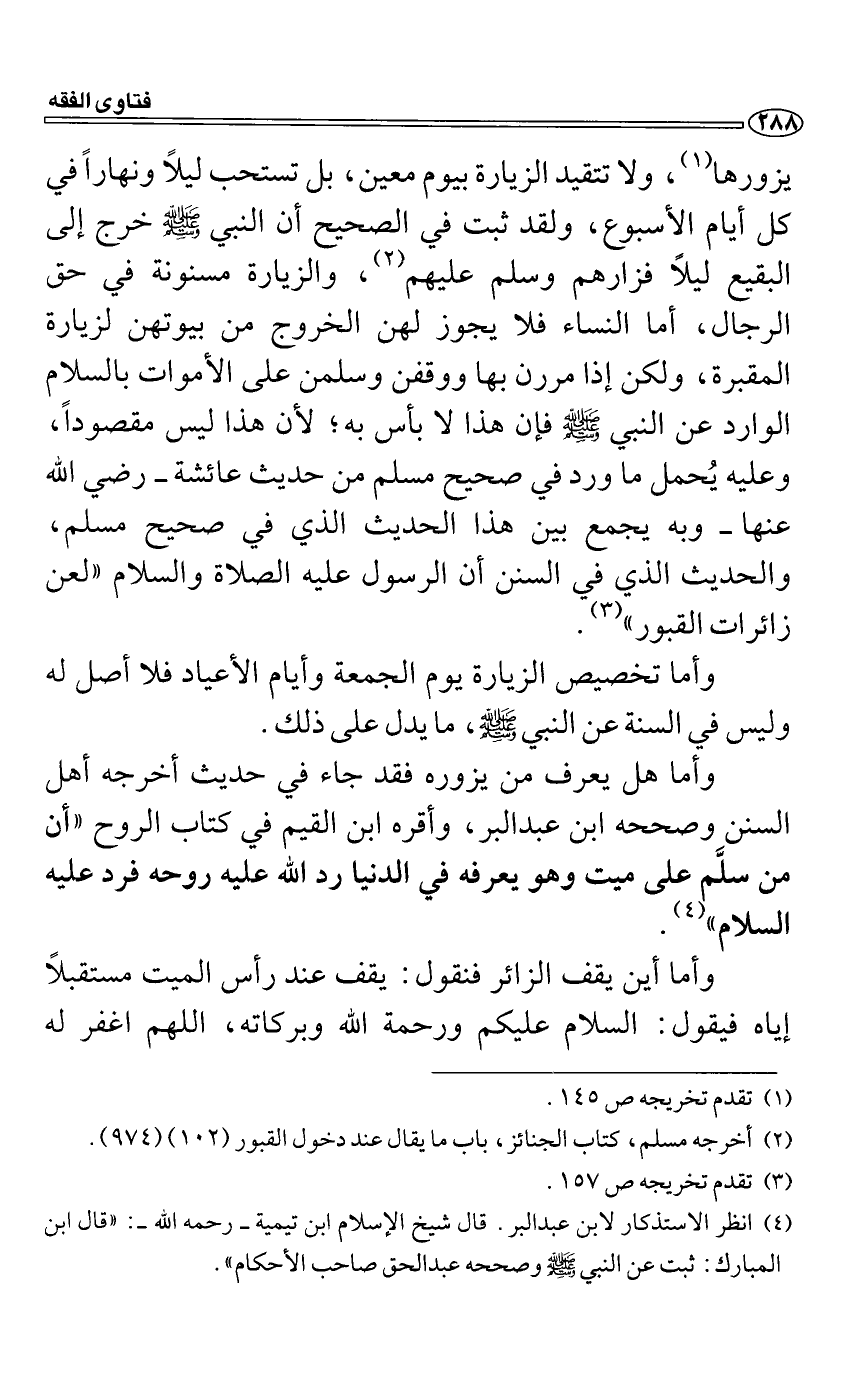 يزورها، ولا تتقيد الزيارة بيوم معين، بل تستحب ليلاً ونهاراً في كل أيام الأسبوع، ولقد ثبت في الصحيح أن النبي صَلَّى اللَّهُ عَلَيْهِ وَسَلَّمَ خرج إلى البقيع ليلاً فزارهم وسلم عليهم، والزيارة مسنونة في حق الرجال، أما النساء فلا يجوز لهن الخروج من بيوتهن لزيارة المقبرة، ولكن إذا مررن بها ووقفن وسلمن على الأموات بالسلام الوارد عن النبي صَلَّى اللَّهُ عَلَيْهِ وَسَلَّمَ فإن هذا لا بأس به؛ لأن هذا ليس مقصوداً، وعليه يُحمل ما ورد في صحيح مسلم من حديث عائشة رضي الله عنها وبه يجمع بين هذا الحديث الذي في صحيح مسلم، والحديث الذي في السنن أن الرسول عليه الصلاة والسلام "لعن زائرات القبور".