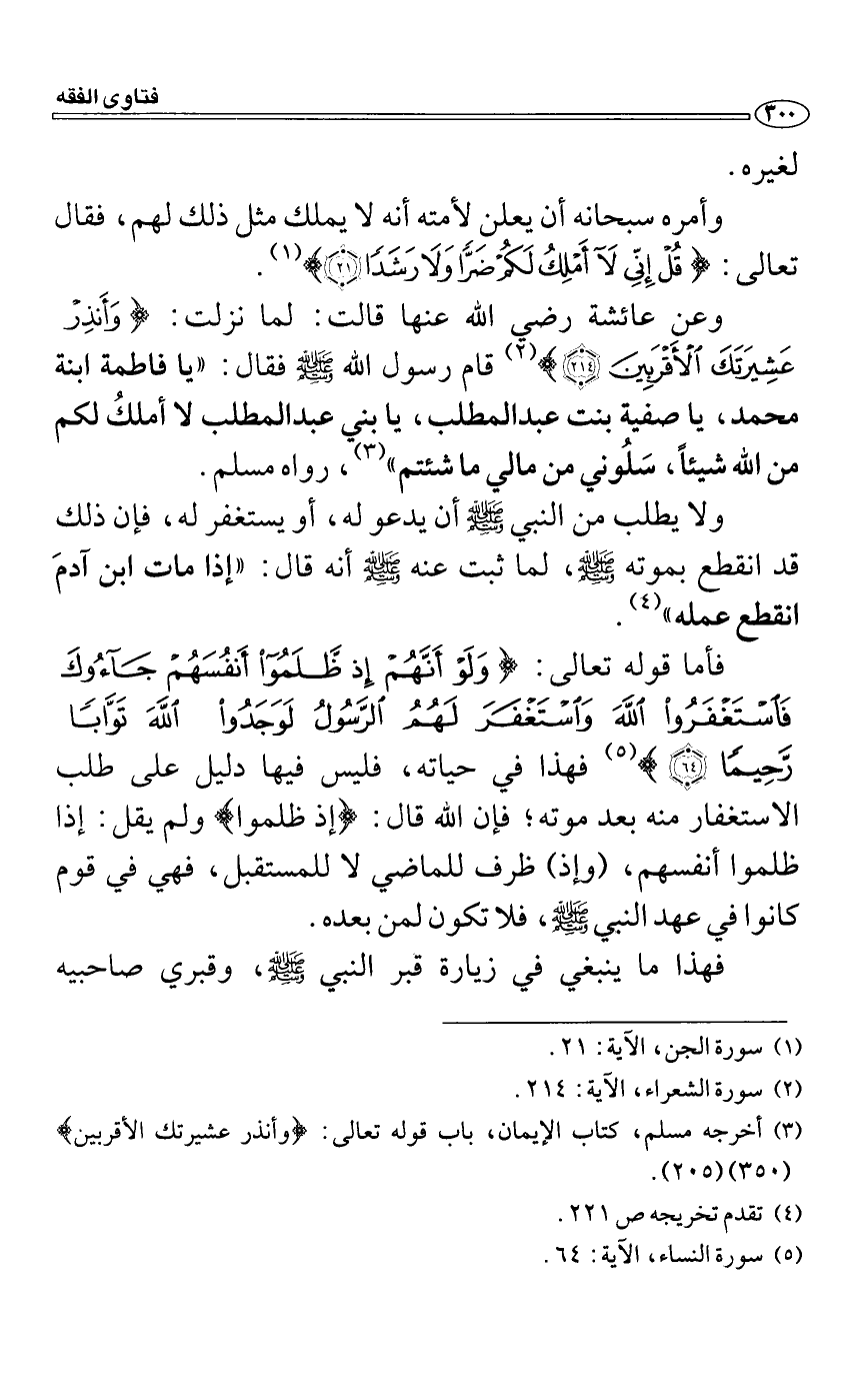 وعن عائشة رضي الله عنها قالت: لما نزلت: {وَأَنذِرْ عَشِيرَتَكَ الأَْقْرَبِينَ} قام رسول الله صَلَّى اللَّهُ عَلَيْهِ وَسَلَّمَ فقال: "يا فاطمة ابنة محمد، يا صفية بنت عبد المطلب، يا بني عبد المطلب لا أملكُ لكم من الله شيئاً، سَلُوني من مالي ما شئتم"، رواه مسلم.