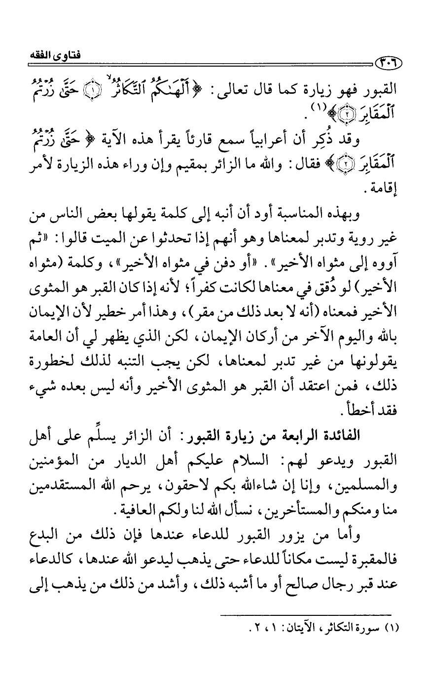 وبهذه المناسبة أود أن أنبه إلى كلمة يقولها بعض الناس من غير روية وتدبر لمعناها وهو أنهم إذا تحدثوا عن الميت قالوا: "ثم آووه إلى مثواه الأخير". "أو دفن في مثواه الأخير"، وكلمة (مثواه الأخير) لو دُقق في معناها لكانت كفراً؛ لأنه إذا كان القبر هو المثوى الأخير فمعناه (أنه لا بعد ذلك من مقر) ، وهذا أمر خطير لأن الإيمان بالله واليوم الا?خر من أركان الإيمان، لكن الذي يظهر لي أن العامة يقولونها من غير تدبر لمعناها، لكن يجب التنبه لذلك لخطورة ذلك، فمن اعتقد أن القبر هو المثوى الأخير وأنه ليس بعده شيء فقد أخطأ.