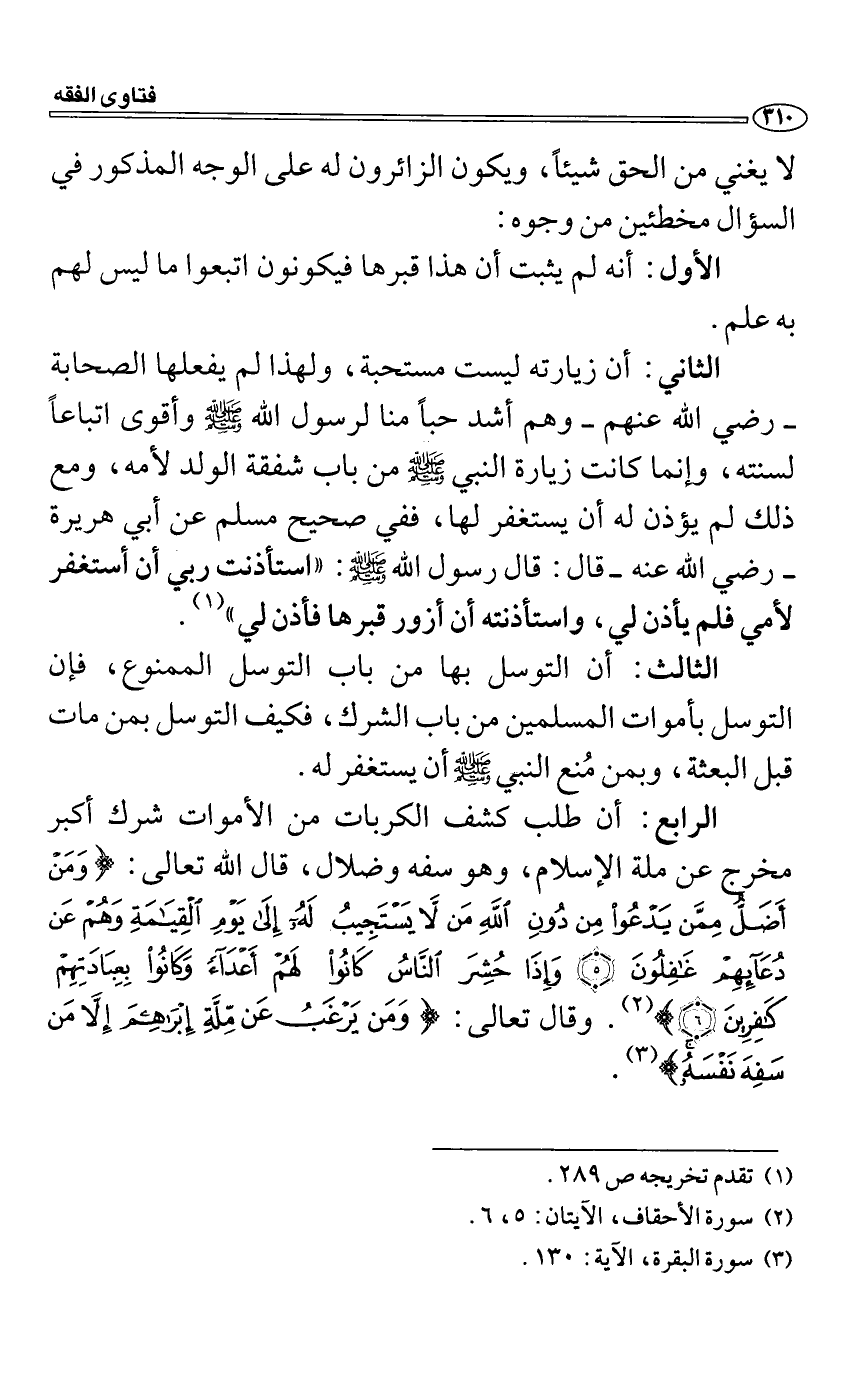 الثاني: أن زيارته ليست مستحبة، ولهذا لم يفعلها الصحابة رضي الله عنهم وهم أشد حباً منا لرسول الله صَلَّى اللَّهُ عَلَيْهِ وَسَلَّمَ وأقوى اتباعاً لسنته، وإنما كانت زيارة النبي صَلَّى اللَّهُ عَلَيْهِ وَسَلَّمَ من باب شفقة الولد لأمه، ومع ذلك لم يؤذن له أن يستغفر لها، ففي صحيح مسلم عن أبي هريرة رضي الله عنه قال: قال رسول الله صَلَّى اللَّهُ عَلَيْهِ وَسَلَّمَ: "استأذنت ربي أن أستغفر لأمي فلم يأذن لي، واستأذنته أن أزور قبرها فأذن لي".