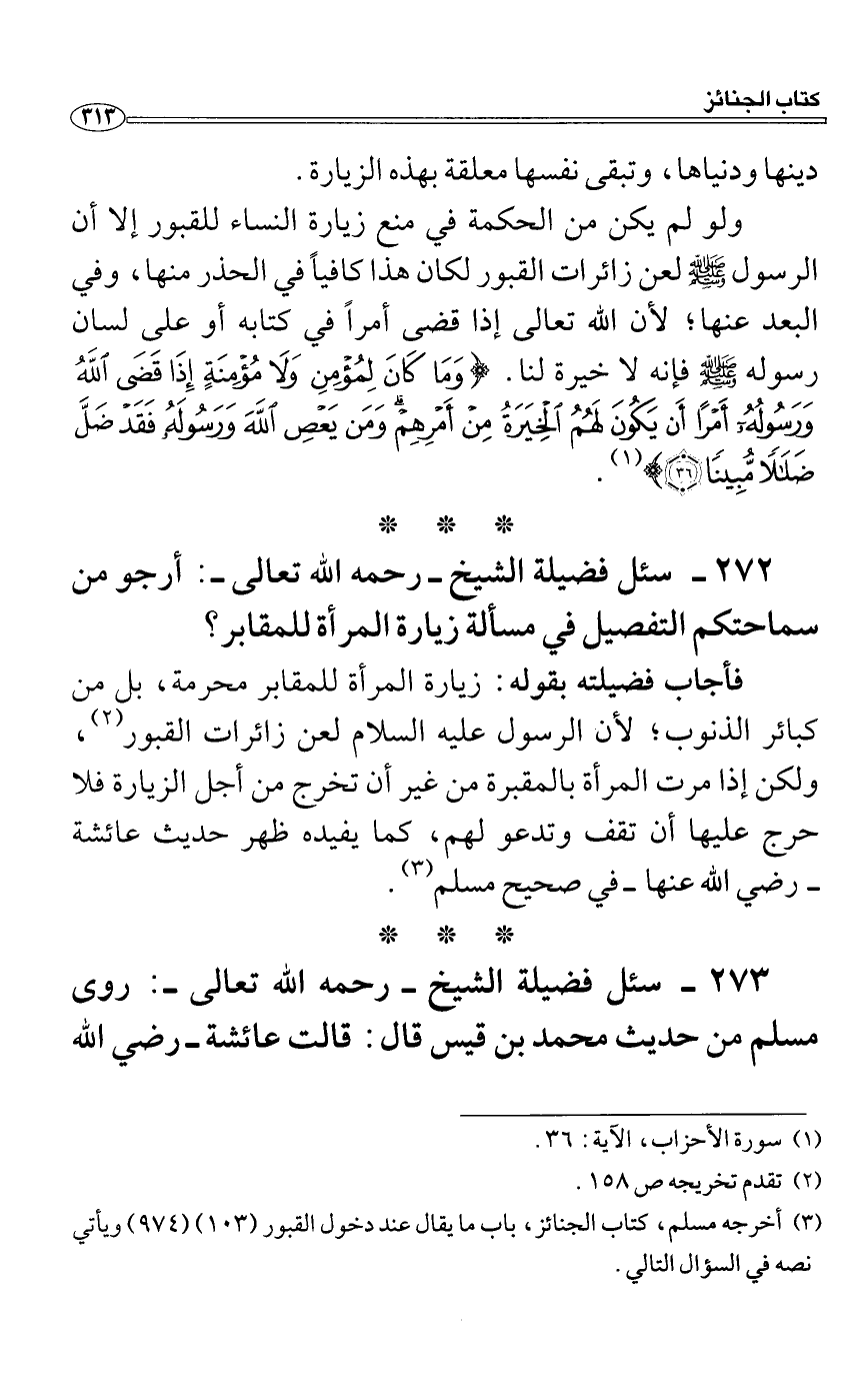 سئل فضيلة الشيخ رحمه الله تعالى: روى مسلم من حديث محمد بن قيس قال: قالت عائشة رضي الله عنها: يا رسول الله كيف أقول لهم؟ قال عليه الصلاة والسلام: "قولي: السلام على أهل الديار من المؤمنين والمسلمين، ويرحم الله المستقدمين منا والمستأخرين، وإنا إن شاءالله بكم للاحقون"، ألا يدل هذا الحديث مع حديث أم عطية رضي الله عنها "نهينا عن اتباع الجنائز ولم يُعْزَمْ علينا"، وغيرها من الأحاديث دلالة واضحة على جواز زيارة النساء للمقابر إذا كن لا يفعلن ما حرم الله، وإذا لم يكن كذلك كيف توجهون حديث محمد بن قيس؟