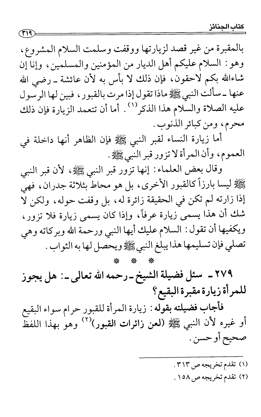 فأجاب فضيلته بقوله: زيارة المرأة للقبور حرام سواء البقيع أو غيره لأن النبي صَلَّى اللَّهُ عَلَيْهِ وَسَلَّمَ (لعن زائرات القبور) وهو بهذا اللفظ صحيح أو حسن.