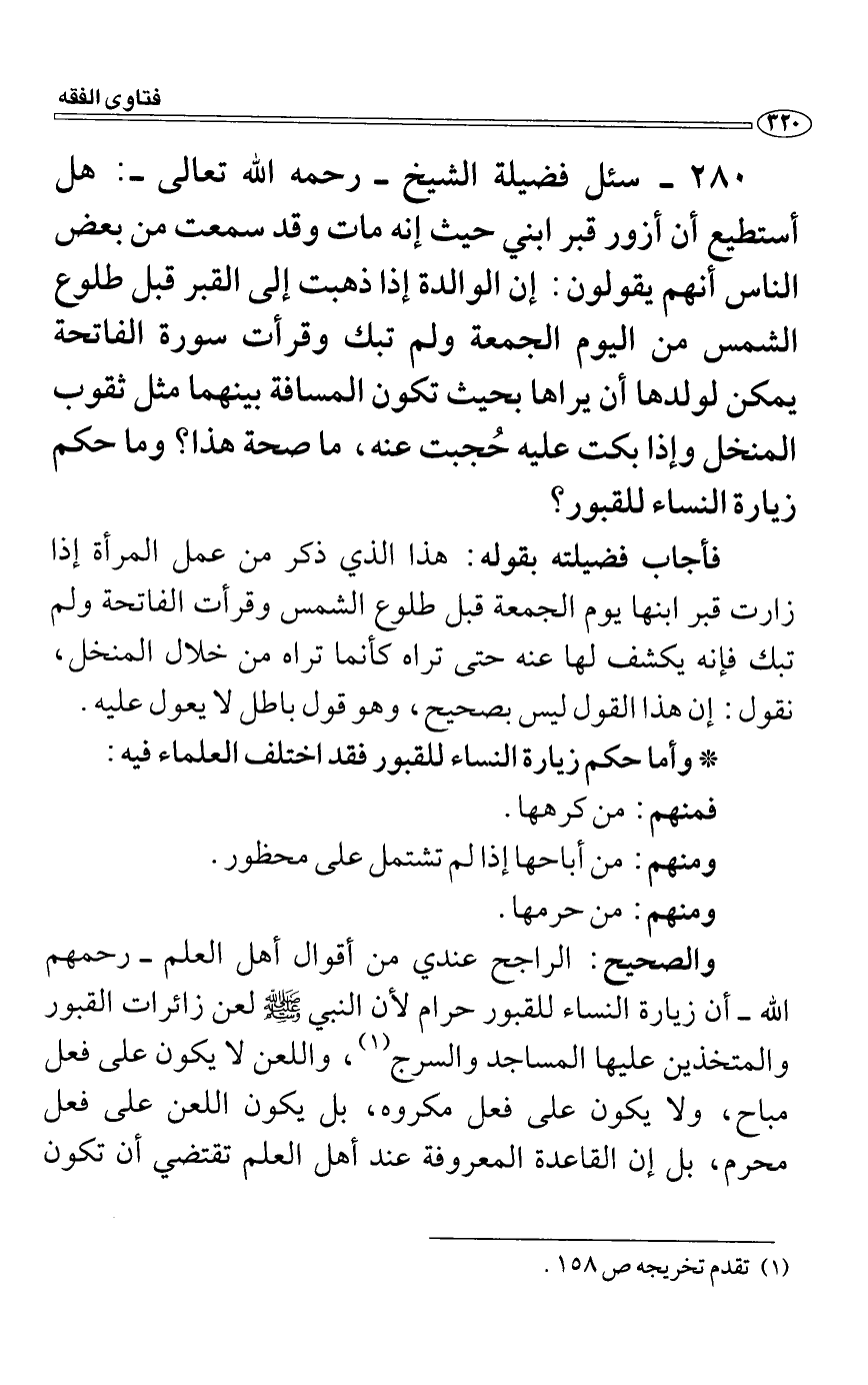 والصحيح: الراجح عندي من أقوال أهل العلم رحمهم الله أن زيارة النساء للقبور حرام لأن النبي صَلَّى اللَّهُ عَلَيْهِ وَسَلَّمَ لعن زائرات القبور والمتخذين عليها المساجد والسرج، واللعن لا يكون على فعل مباح، ولا يكون على فعل مكروه، بل يكون اللعن على فعل محرم، بل إن القاعدة المعروفة عند أهل العلم تقتضي أن تكون