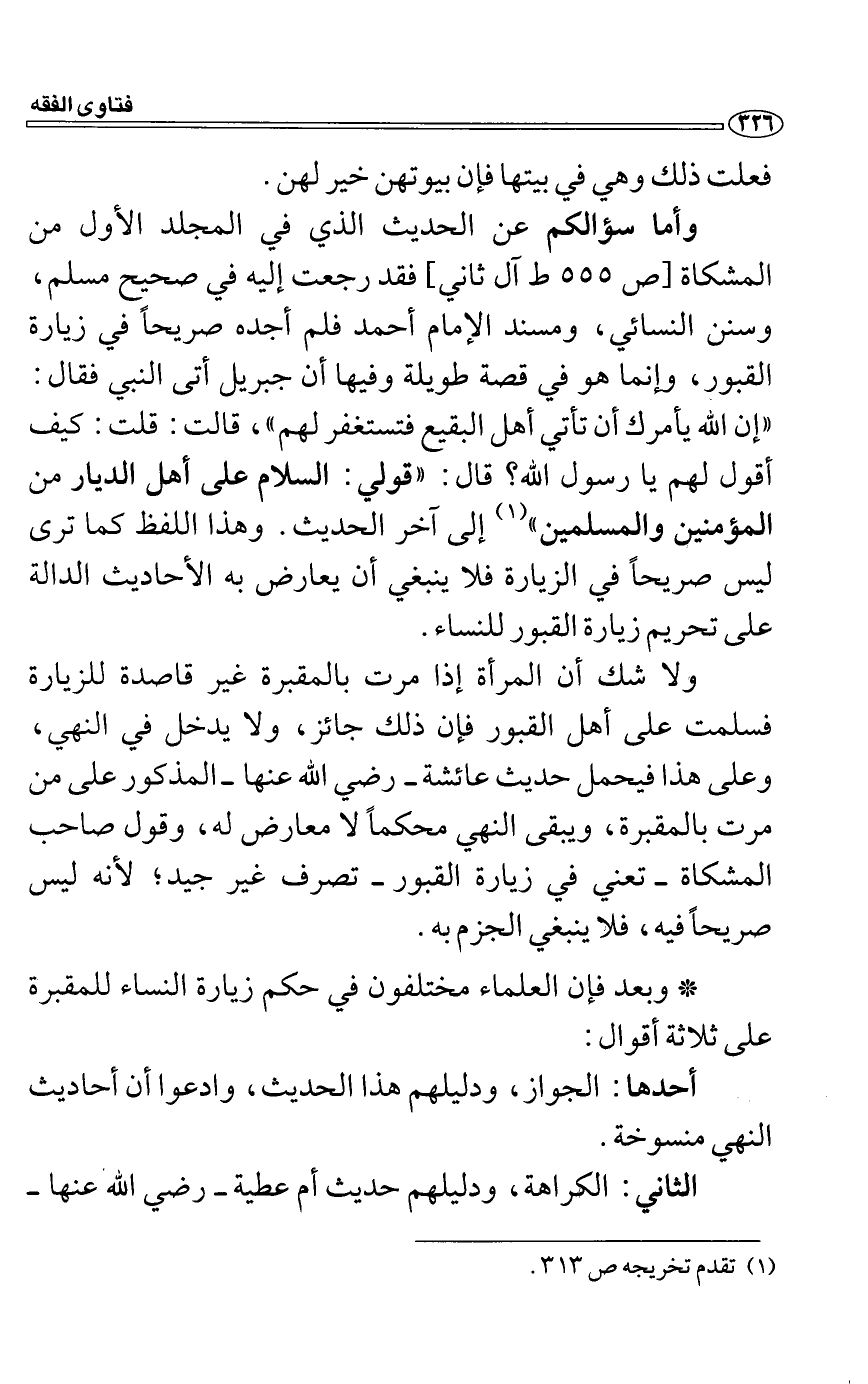 وأما سؤالكم عن الحديث الذي في المجلد الأول من المشكاة [ص 555 ط آل ثاني] فقد رجعت إليه في صحيح مسلم، وسنن النسائي، ومسند الإمام أحمد فلم أجده صريحاً في زيارة القبور، وإنما هو في قصة طويلة وفيها أن جبريل أتى النبي فقال: "إن الله يأمرك أن تأتي أهل البقيع فتستغفر لهم"، قالت: قلت: كيف أقول لهم يا رسول الله؟ قال: "قولي: السلام على أهل الديار من المؤمنين والمسلمين" إلى آخر الحديث. وهذا اللفظ كما ترى ليس صريحاً في الزيارة فلا ينبغي أن يعارض به الأحاديث الدالة على تحريم زيارة القبور للنساء.