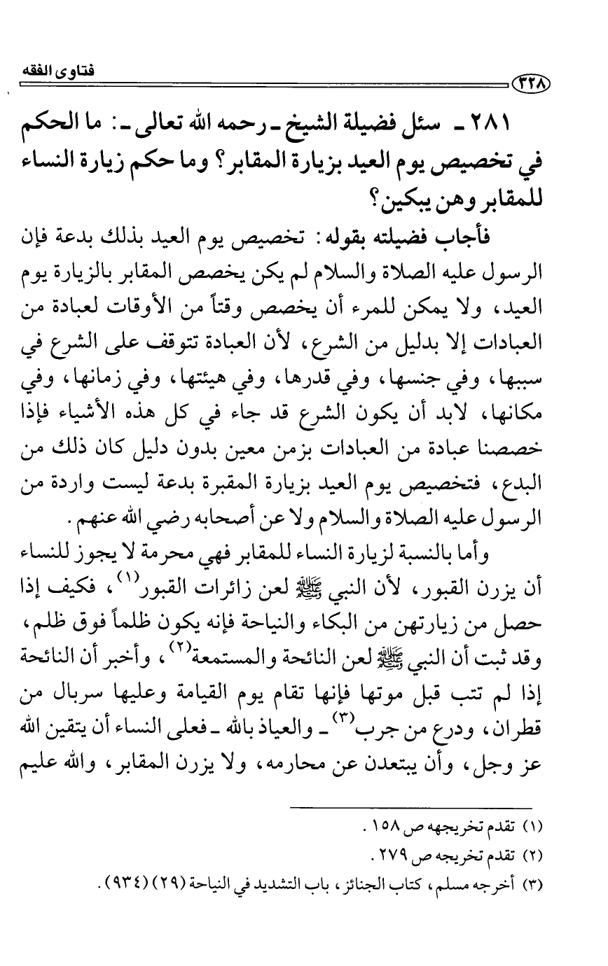 سئل فضيلة الشيخ رحمه الله تعالى: ما الحكم في تخصيص يوم العيد بزيارة المقابر؟ وما حكم زيارة النساء للمقابر وهن يبكين؟