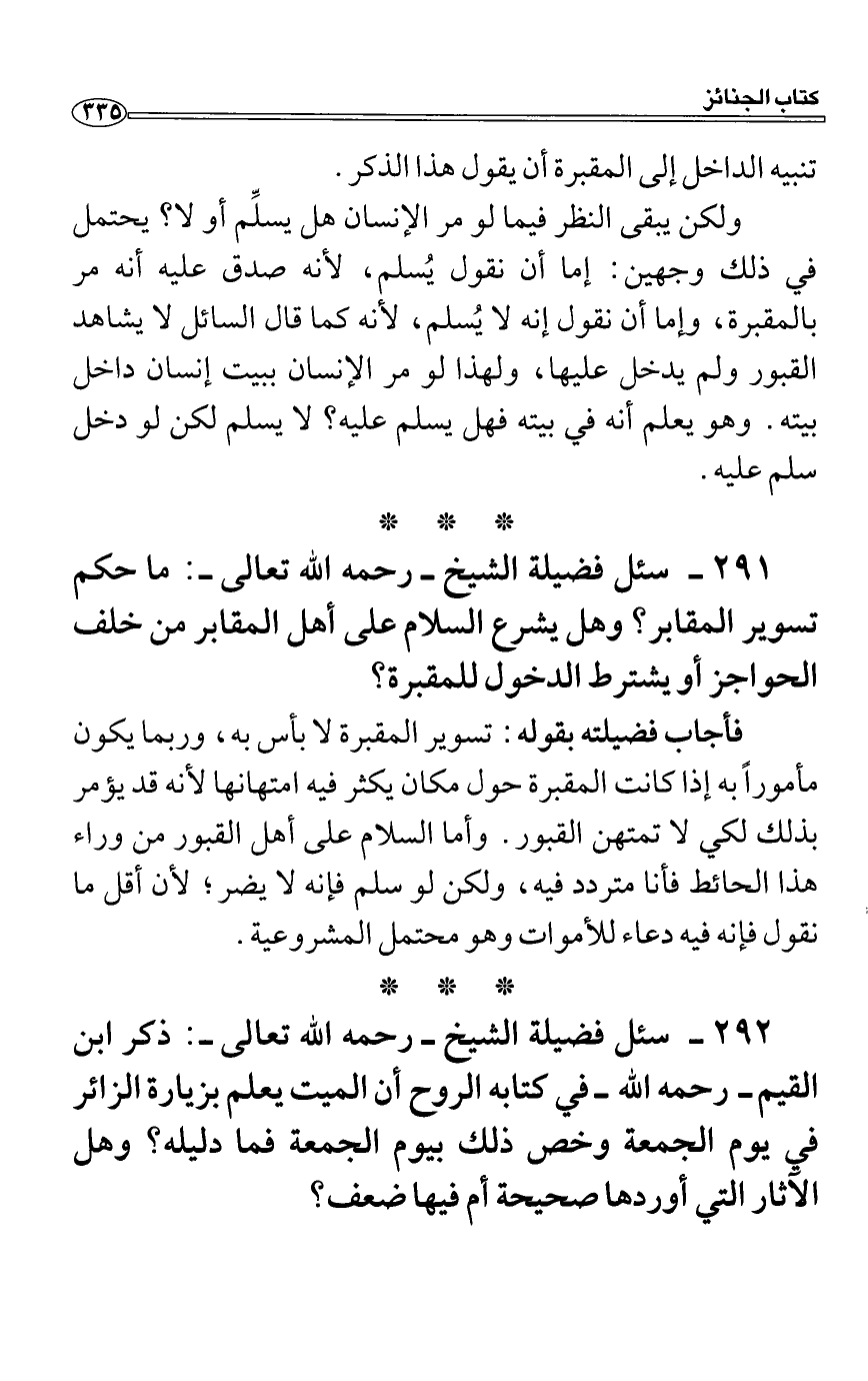 فأجاب فضيلته بقوله: تسوير المقبرة لا بأس به، وربما يكون مأموراً به إذا كانت المقبرة حول مكان يكثر فيه امتهانها لأنه قد يؤمر بذلك لكي لا تمتهن القبور. وأما السلام على أهل القبور من وراء هذا الحائط فأنا متردد فيه، ولكن لو سلم فإنه لا يضر؛ لأن أقل ما نقول فإنه فيه دعاء للأموات وهو محتمل المشروعية.