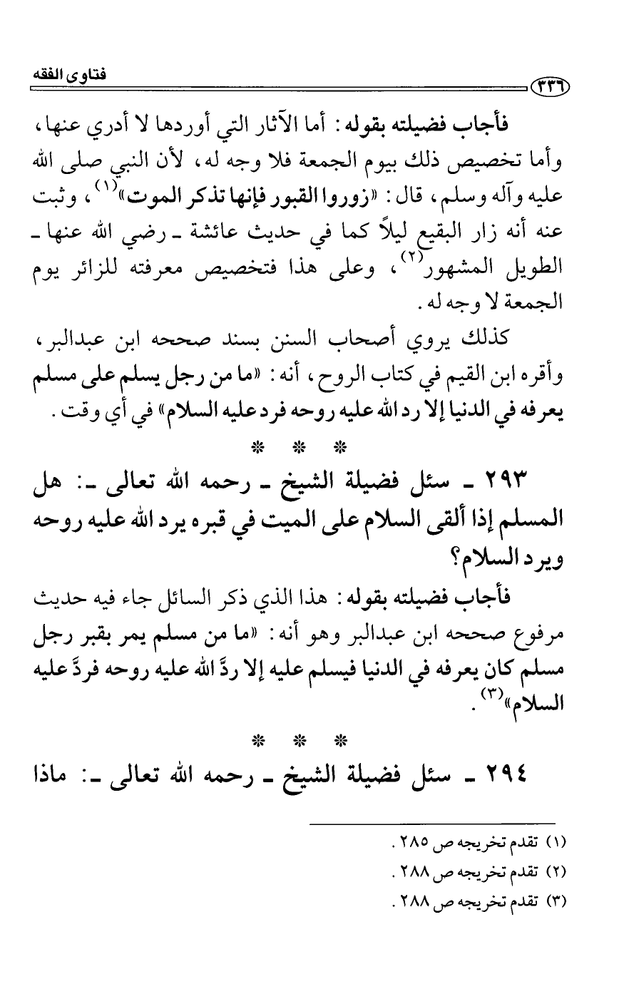 فأجاب فضيلته بقوله: أما الا?ثار التي أوردها لا أدري عنها، وأما تخصيص ذلك بيوم الجمعة فلا وجه له، لأن النبي صلى الله عليه وآله وسلم، قال: "زوروا القبور فإنها تذكر الموت"، وثبت عنه أنه زار البقيع ليلاً كما في حديث عائشة رضي الله عنها الطويل المشهور، وعلى هذا فتخصيص معرفته للزائر يوم الجمعة لا وجه له.
