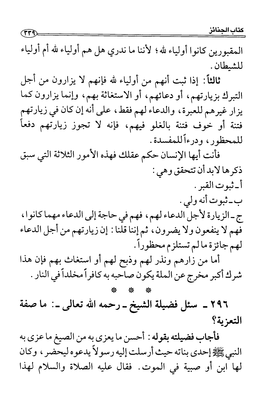 فأجاب فضيلته بقوله: أحسن ما يعزى به من الصيغ ما عزى به النبي صَلَّى اللَّهُ عَلَيْهِ وَسَلَّمَ إحدى بناته حيث أرسلت إليه رسولاً يدعوه ليحضر، وكان لها ابن أو صبية في الموت. فقال عليه الصلاة والسلام لهذا