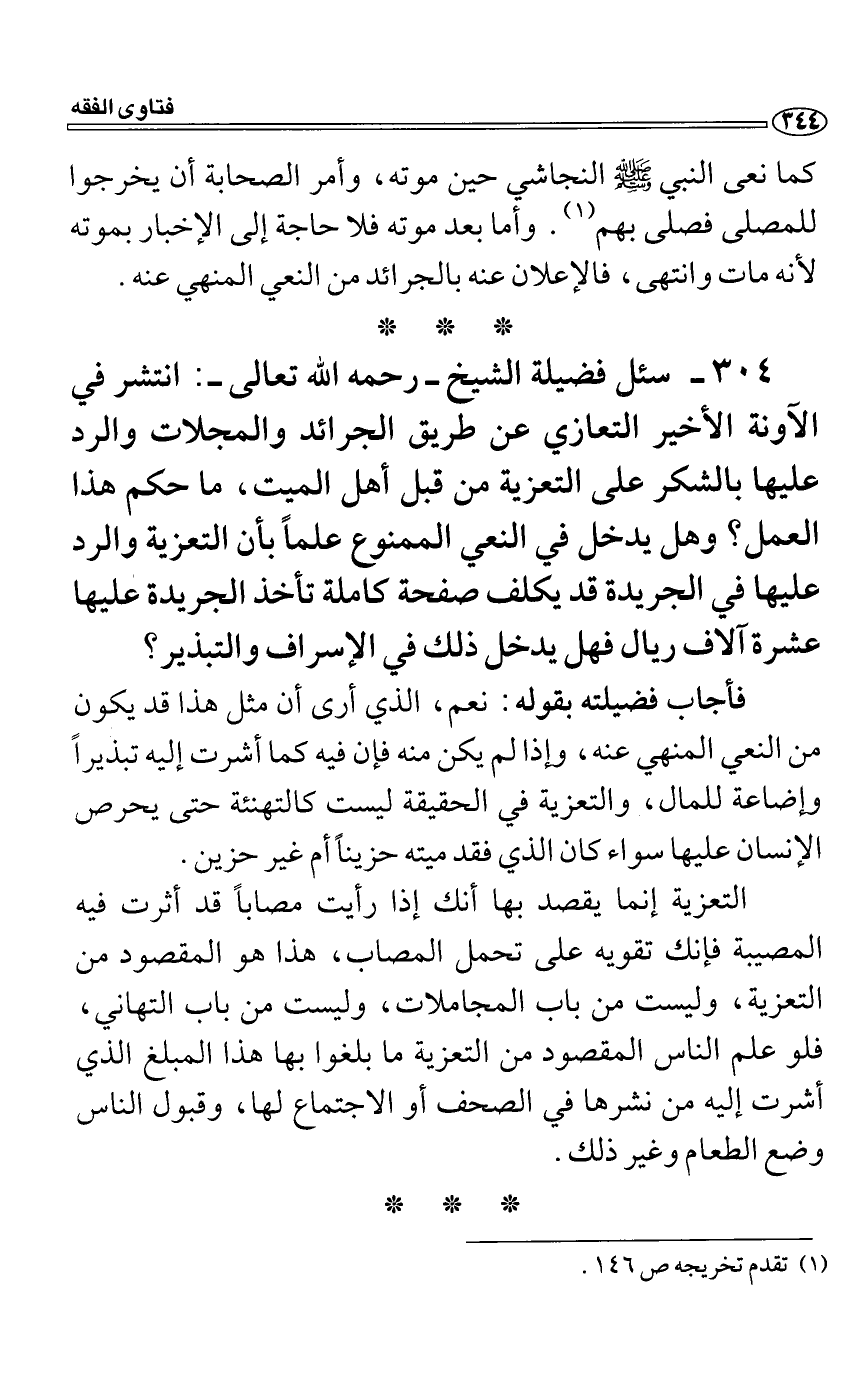 سئل فضيلة الشيخ رحمه الله تعالى: انتشر في الآونة الأخير التعازي عن طريق الجرائد والمجلات والرد عليها بالشكر على التعزية من قبل أهل الميت، ما حكم هذا العمل؟ وهل يدخل في النعي الممنوع علماً بأن التعزية والرد عليها في الجريدة قد يكلف صفحة كاملة تأخذ الجريدة عليها عشرة آلاف ريال فهل يدخل ذلك في الإسراف والتبذير؟