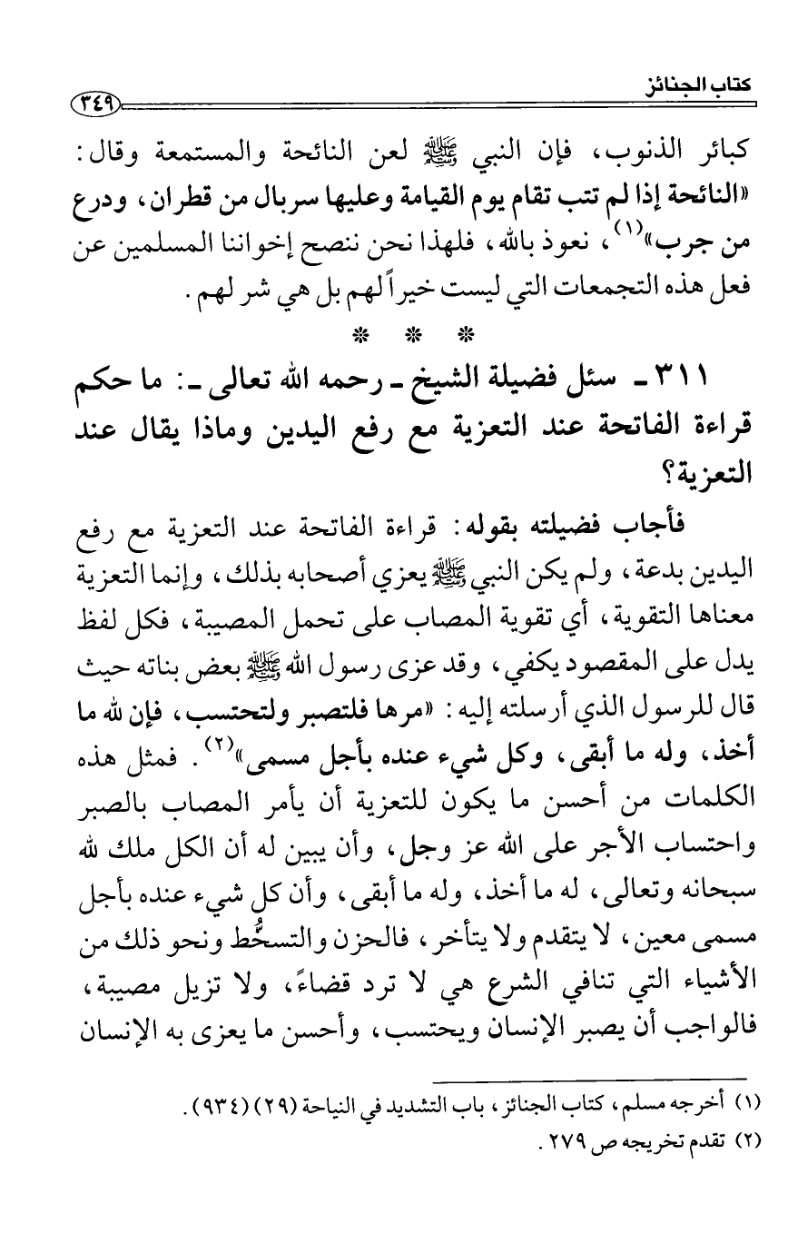 فأجاب فضيلته بقوله: قراءة الفاتحة عند التعزية مع رفع اليدين بدعة، ولم يكن النبي صَلَّى اللَّهُ عَلَيْهِ وَسَلَّمَ يعزي أصحابه بذلك، وإنما التعزية معناها التقوية، أي تقوية المصاب على تحمل المصيبة، فكل لفظ يدل على المقصود يكفي، وقد عزى رسول الله صَلَّى اللَّهُ عَلَيْهِ وَسَلَّمَ بعض بناته حيث قال للرسول الذي أرسلته إليه: "مرها فلتصبر ولتحتسب، فإن لله ما أخذ، وله ما أبقى، وكل شيء عنده بأجل مسمى". فمثل هذه الكلمات من أحسن ما يكون للتعزية أن يأمر المصاب بالصبر واحتساب الأجر على الله عز وجل، وأن يبين له أن الكل ملك لله سبحانه وتعالى، له ما أخذ، وله ما أبقى، وأن كل شيء عنده بأجل مسمى معين، لا يتقدم ولا يتأخر، فالحزن والتسخُّط ونحو ذلك من الأشياء التي تنافي الشرع هي لا ترد قضاءً، ولا تزيل مصيبة، فالواجب أن يصبر الإنسان ويحتسب، وأحسن ما يعزى به الإنسان