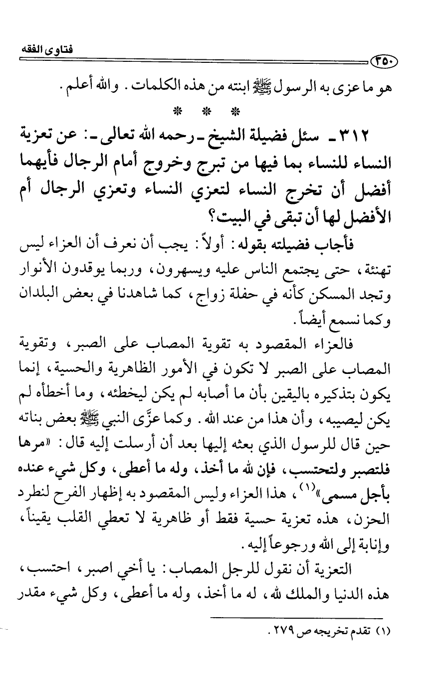 سئل فضيلة الشيخ رحمه الله تعالى: عن تعزية النساء للنساء بما فيها من تبرج وخروج أمام الرجال فأيهما أفضل أن تخرج النساء لتعزي النساء وتعزي الرجال أم الأفضل لها أن تبقى في البيت؟