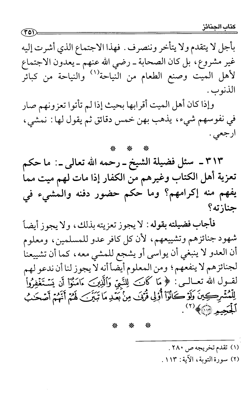 سئل فضيلة الشيخ رحمه الله تعالى: ما حكم تعزية أهل الكتاب وغيرهم من الكفار إذا مات لهم ميت مما يفهم منه إكرامهم؟ وما حكم حضور دفنه والمشيء في جنازته؟