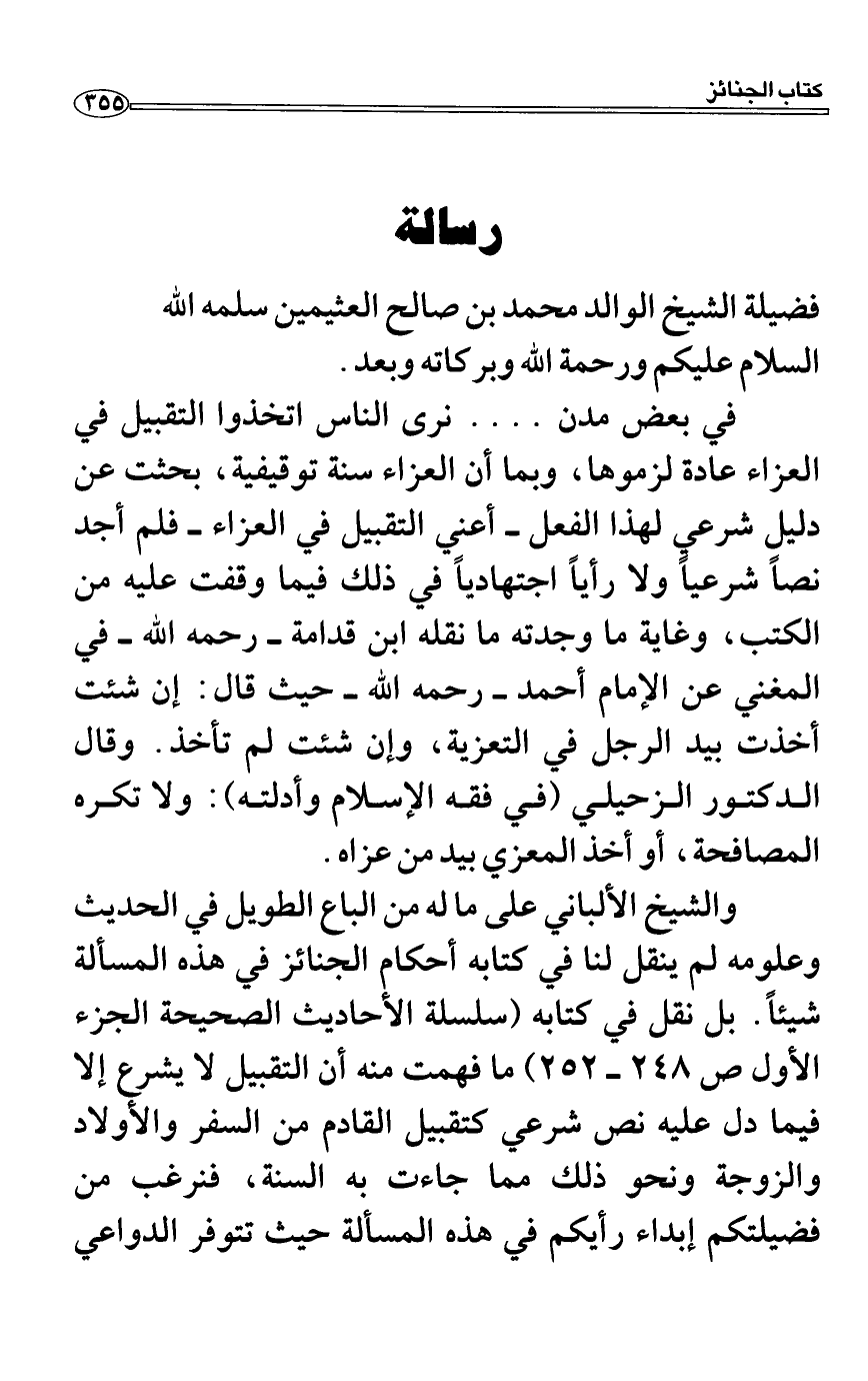 في بعض مدن.... نرى الناس اتخذوا التقبيل في العزاء عادة لزموها، وبما أن العزاء سنة توقيفية، بحثت عن دليل شرعي لهذا الفعل أعني التقبيل في العزاء فلم أجد نصاً شرعياً ولا رأياً اجتهادياً في ذلك فيما وقفت عليه من الكتب، وغاية ما وجدته ما نقله ابن قدامة رحمه الله في المغني عن الإمام أحمد رحمه الله حيث قال: إن شئت أخذت بيد الرجل في التعزية، وإن شئت لم تأخذ. وقال الدكتور الزحيلي (في فقه الإسلام وأدلته) : ولا تكره المصافحة، أو أخذ المعزي بيد من عزاه.