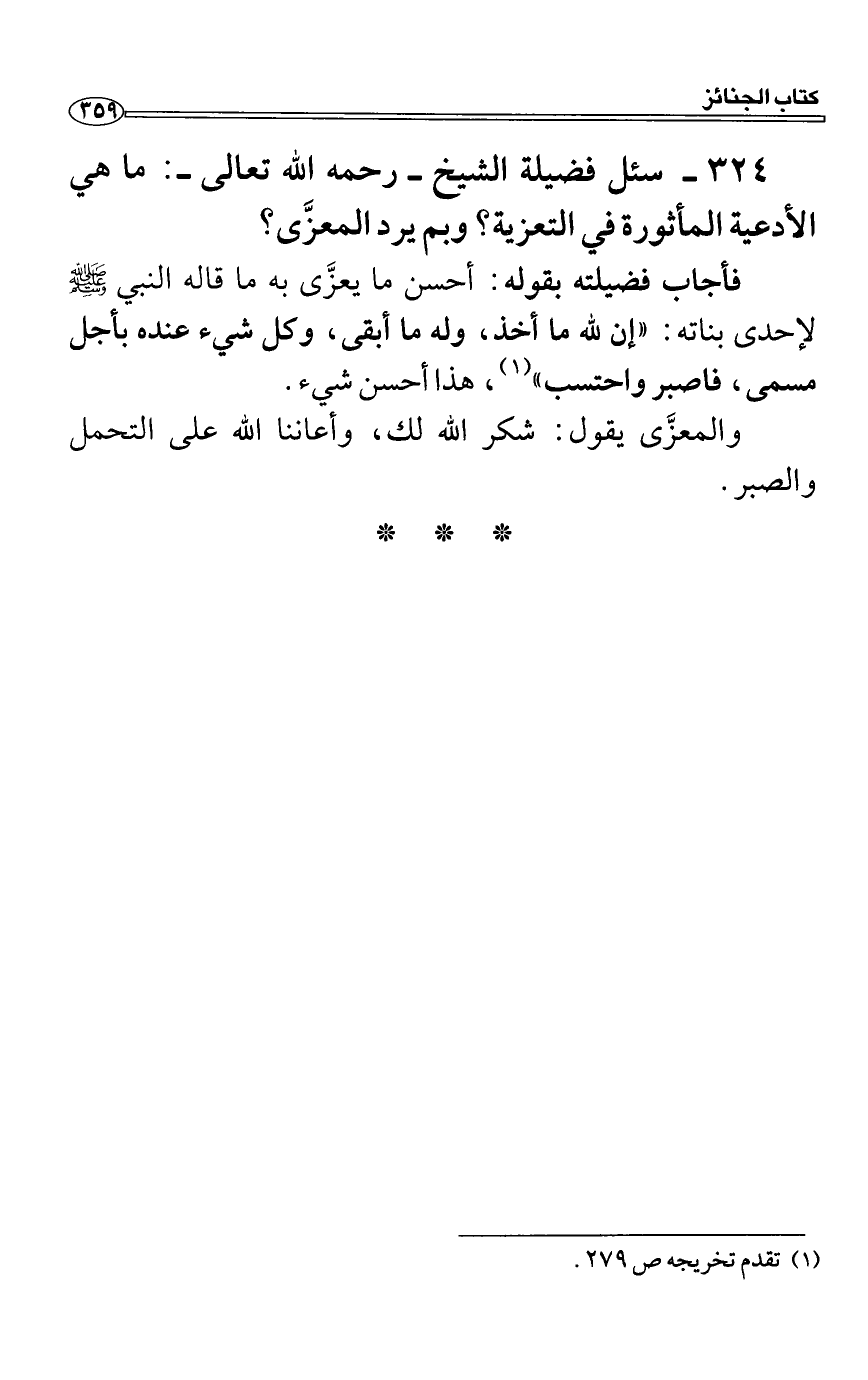 سئل فضيلة الشيخ رحمه الله تعالى: ما هي الأدعية المأثورة في التعزية؟ وبم يرد المعزَّى؟