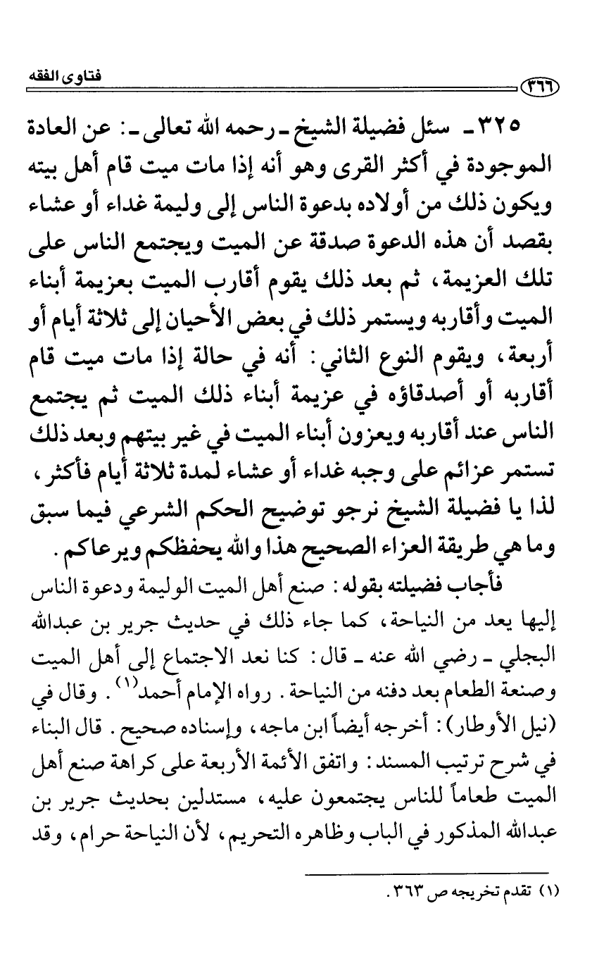 فأجاب فضيلته بقوله: صنع أهل الميت الوليمة ودعوة الناس إليها يعد من النياحة، كما جاء ذلك في حديث جرير بن عبد الله البجلي رضي الله عنه قال: كنا نعد الاجتماع إلى أهل الميت وصنعة الطعام بعد دفنه من النياحة. رواه الإمام أحمد. وقال في (نيل الأوطار) : أخرجه أيضاً ابن ماجه، وإسناده صحيح. قال البناء في شرح ترتيب المسند: واتفق الأئمة الأربعة على كراهة صنع أهل الميت طعاماً للناس يجتمعون عليه، مستدلين بحديث جرير بن عبد الله المذكور في الباب وظاهره التحريم، لأن النياحة حرام، وقد
