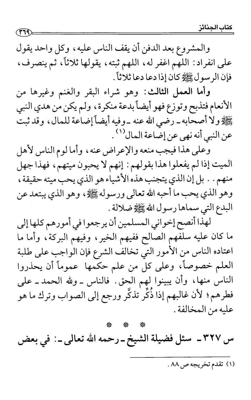 وعلى هذا فيجب منعه والإعراض عنه، وأما لوم الناس لأهل الميت إذا لم يفعلوا هذا بقولهم: إنهم لا يحبون ميتهم، فهذا جهل منهم.. بل إن الذي يتجنب هذه الأشياء هو الذي يحب ميته حقيقة، وهو الذي يحب ما أحبه الله تعالى ورسوله صَلَّى اللَّهُ عَلَيْهِ وَسَلَّمَ، وهو الذي يبتعد عن البدع التي سماها رسول الله صَلَّى اللَّهُ عَلَيْهِ وَسَلَّمَ ضلالة.