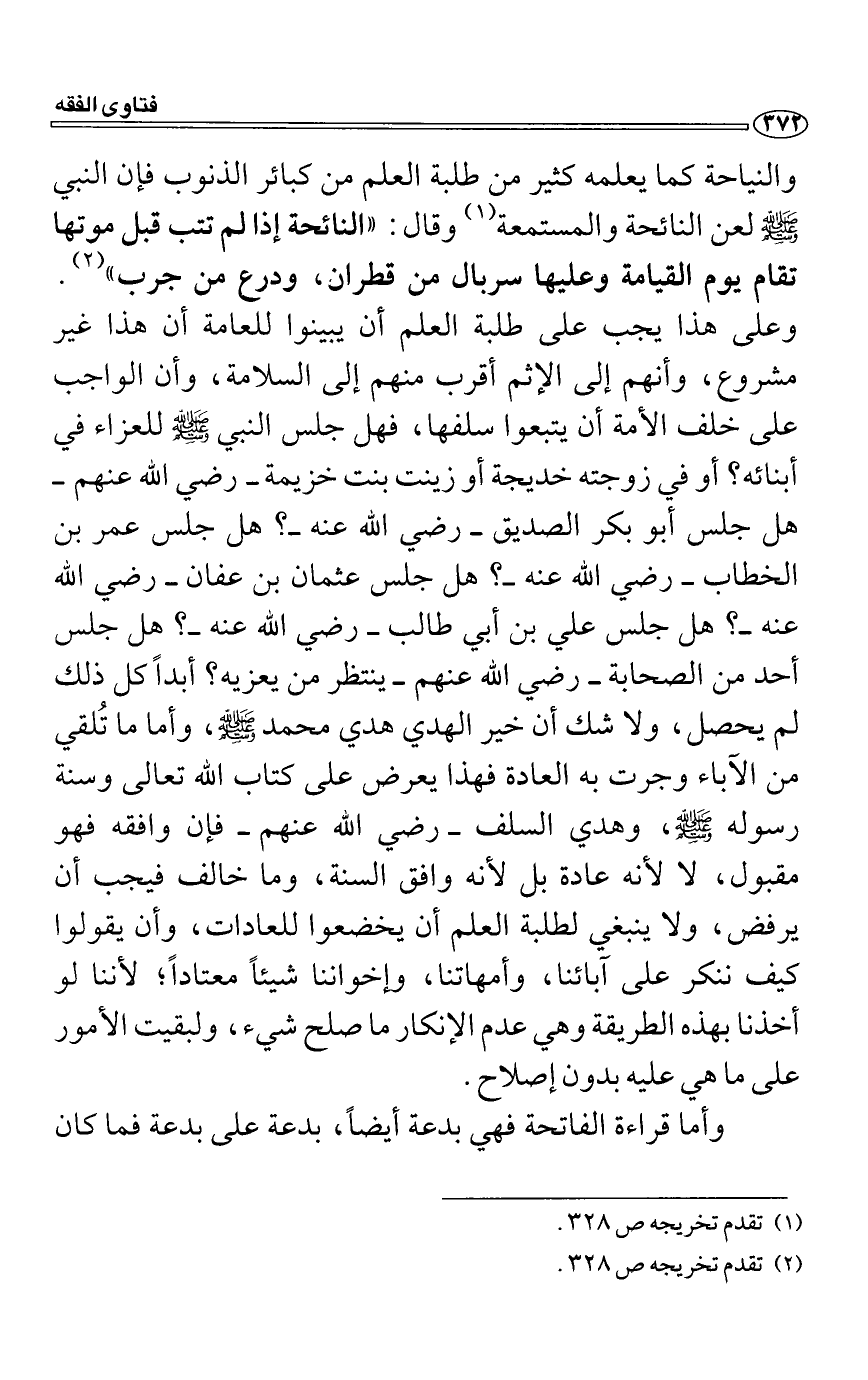والنياحة كما يعلمه كثير من طلبة العلم من كبائر الذنوب فإن النبي صَلَّى اللَّهُ عَلَيْهِ وَسَلَّمَ لعن النائحة والمستمعة وقال: "النائحة إذا لم تتب قبل موتها تقام يوم القيامة وعليها سربال من قطران، ودرع من جرب". وعلى هذا يجب على طلبة العلم أن يبينوا للعامة أن هذا غير مشروع، وأنهم إلى الإثم أقرب منهم إلى السلامة، وأن الواجب على خلف الأمة أن يتبعوا سلفها، فهل جلس النبي صَلَّى اللَّهُ عَلَيْهِ وَسَلَّمَ للعزاء في أبنائه؟ أو في زوجته خديجة أو زينت بنت خزيمة رضي الله عنهم هل جلس أبو بكر الصديق رضي الله عنه؟ هل جلس عمر بن الخطاب رضي الله عنه؟ هل جلس عثمان بن عفان رضي الله عنه؟ هل جلس علي بن أبي طالب رضي الله عنه؟ هل جلس أحد من الصحابة رضي الله عنهم ينتظر من يعزيه؟ أبداً كل ذلك لم يحصل، ولا شك أن خير الهدي هدي محمد صَلَّى اللَّهُ عَلَيْهِ وَسَلَّمَ، وأما ما تُلقي من الا?باء وجرت به العادة فهذا يعرض على كتاب الله تعالى وسنة رسوله صَلَّى اللَّهُ عَلَيْهِ وَسَلَّمَ، وهدي السلف رضي الله عنهم فإن وافقه فهو مقبول، لا لأنه عادة بل لأنه وافق السنة، وما خالف فيجب أن يرفض، ولا ينبغي لطلبة العلم أن يخضعوا للعادات، وأن يقولوا كيف ننكر على آبائنا، وأمهاتنا، وإخواننا شيئاً معتاداً؛ لأننا لو أخذنا بهذه الطريقة وهي عدم الإنكار ما صلح شيء، ولبقيت الأمور على ما هي عليه بدون إصلاح.