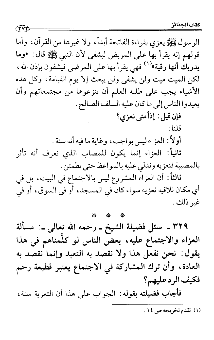 الرسول صَلَّى اللَّهُ عَلَيْهِ وَسَلَّمَ يعزي بقراءة الفاتحة أبداً، ولا غيرها من القرآن، وأما قولهم إنه يقرأ بها على المريض ليشفى لأن النبي صَلَّى اللَّهُ عَلَيْهِ وَسَلَّمَ قال: "وما يدريك أنها رقية" فهي يقرأ بها على المرضى فيشفون بإذن الله، لكن الميت ميت ولن يشفى ولن يبعث إلا يوم القيامة، وكل هذه الأشياء يجب على طلبة العلم أن ينزعوها من مجتمعاتهم وأن يعيدوا الناس إلى ما كان عليه السلف الصالح.