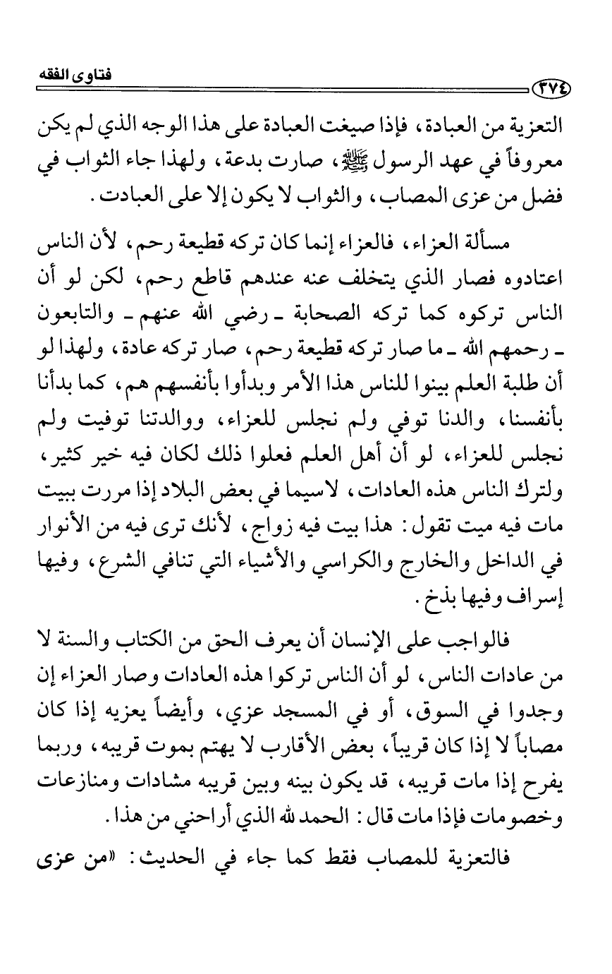 مسألة العزاء، فالعزاء إنما كان تركه قطيعة رحم، لأن الناس اعتادوه فصار الذي يتخلف عنه عندهم قاطع رحم، لكن لو أن الناس تركوه كما تركه الصحابة رضي الله عنهم والتابعون رحمهم الله ما صار تركه قطيعة رحم، صار تركه عادة، ولهذا لو أن طلبة العلم بينوا للناس هذا الأمر وبدأوا بأنفسهم هم، كما بدأنا بأنفسنا، والدنا توفي ولم نجلس للعزاء، ووالدتنا توفيت ولم نجلس للعزاء، لو أن أهل العلم فعلوا ذلك لكان فيه خير كثير، ولترك الناس هذه العادات، لاسيما في بعض البلاد إذا مررت ببيت مات فيه ميت تقول: هذا بيت فيه زواج، لأنك ترى فيه من الأنوار في الداخل والخارج والكراسي والأشياء التي تنافي الشرع، وفيها إسراف وفيها بذخ.